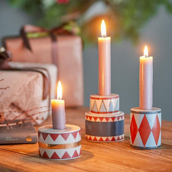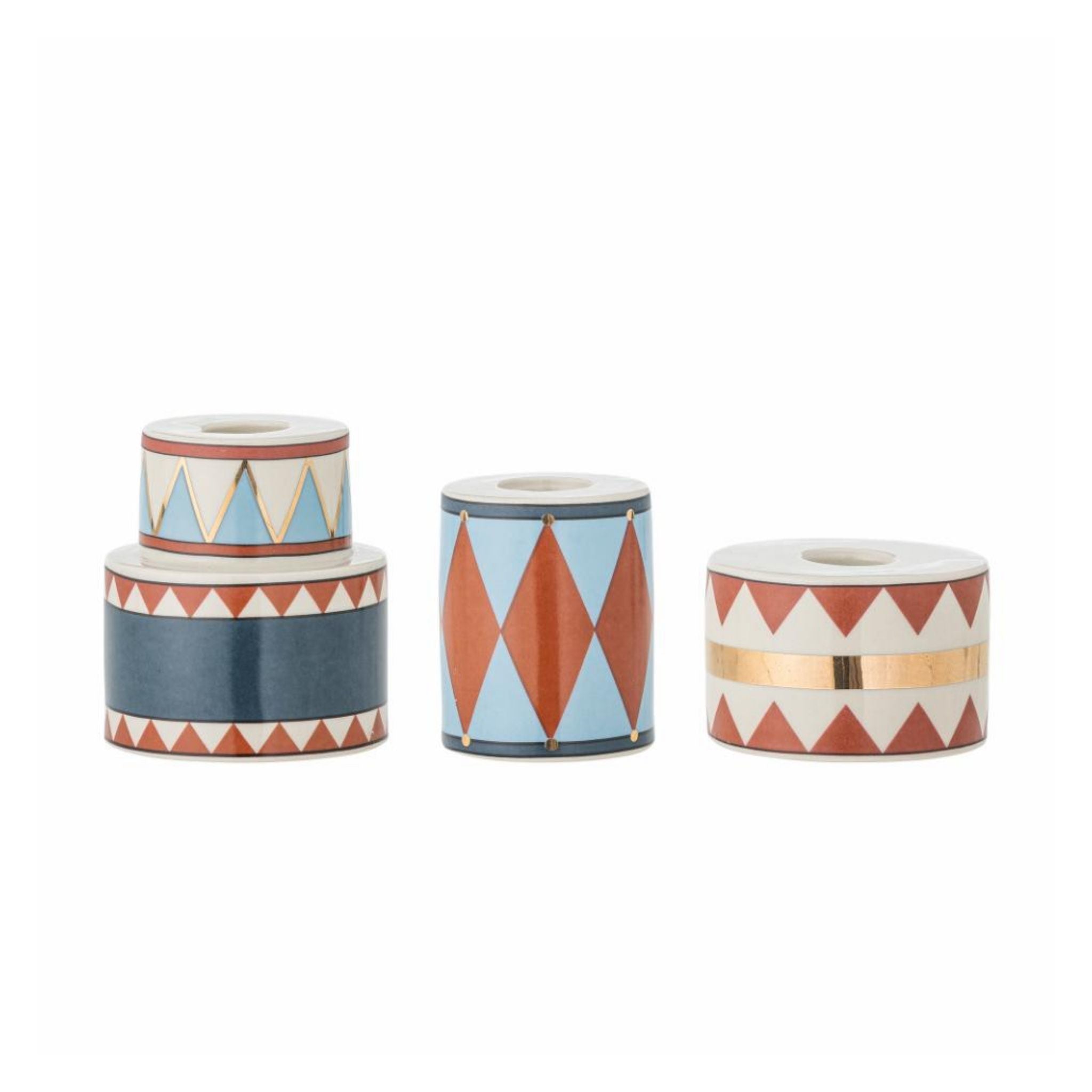 Lysestagerne fra Bloomingville er et sæt af tre i stentøj, formet som små trommer med festlige mønstre.