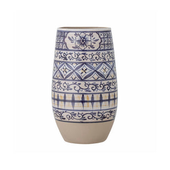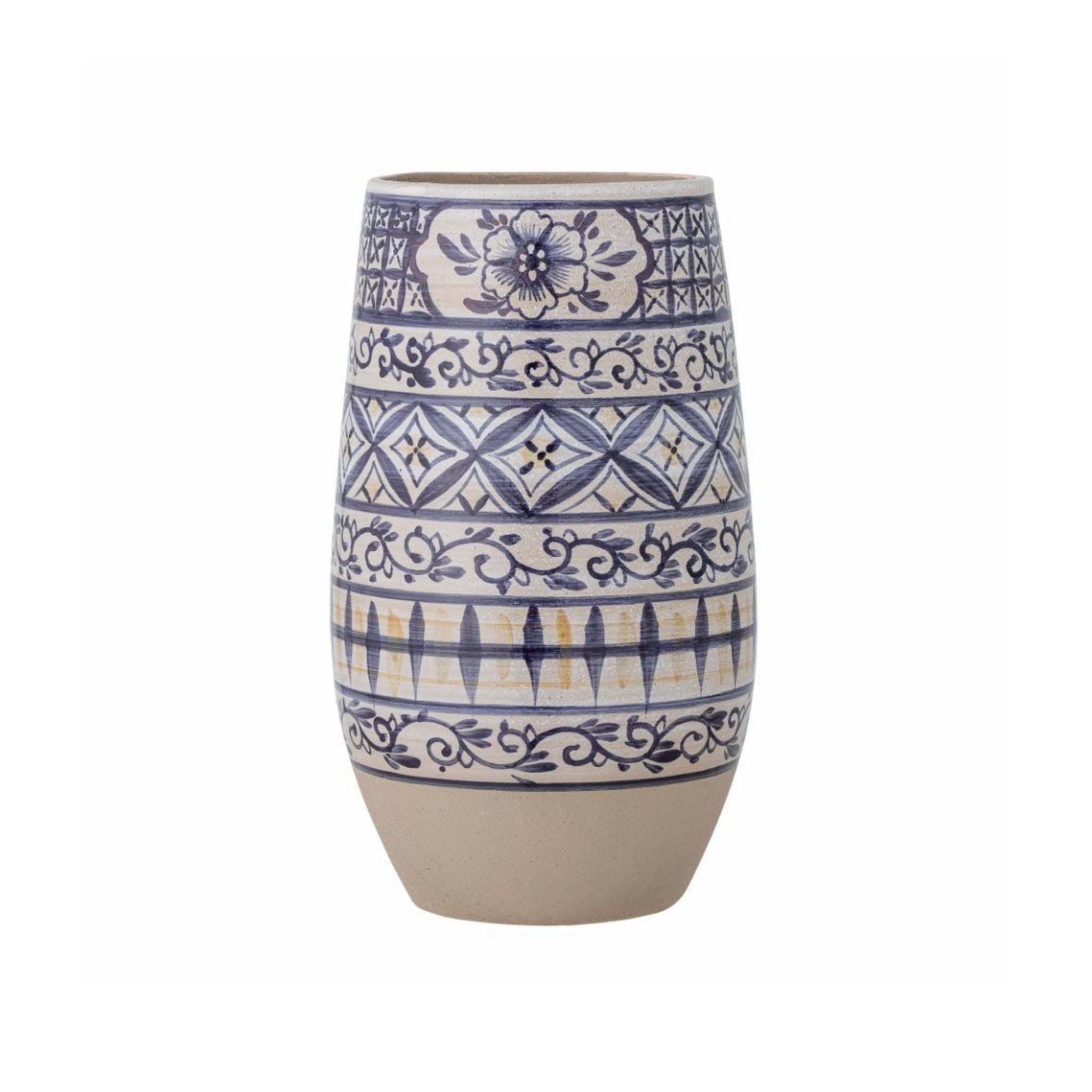 Nadya vasen fra Bloomingville er lavet i smukt stentøj med blå nuancer og dekoreret med et grafisk mønster, der er malet i hånden. Hver vase er unik, hvilket giver den et personligt og kunstnerisk præg.