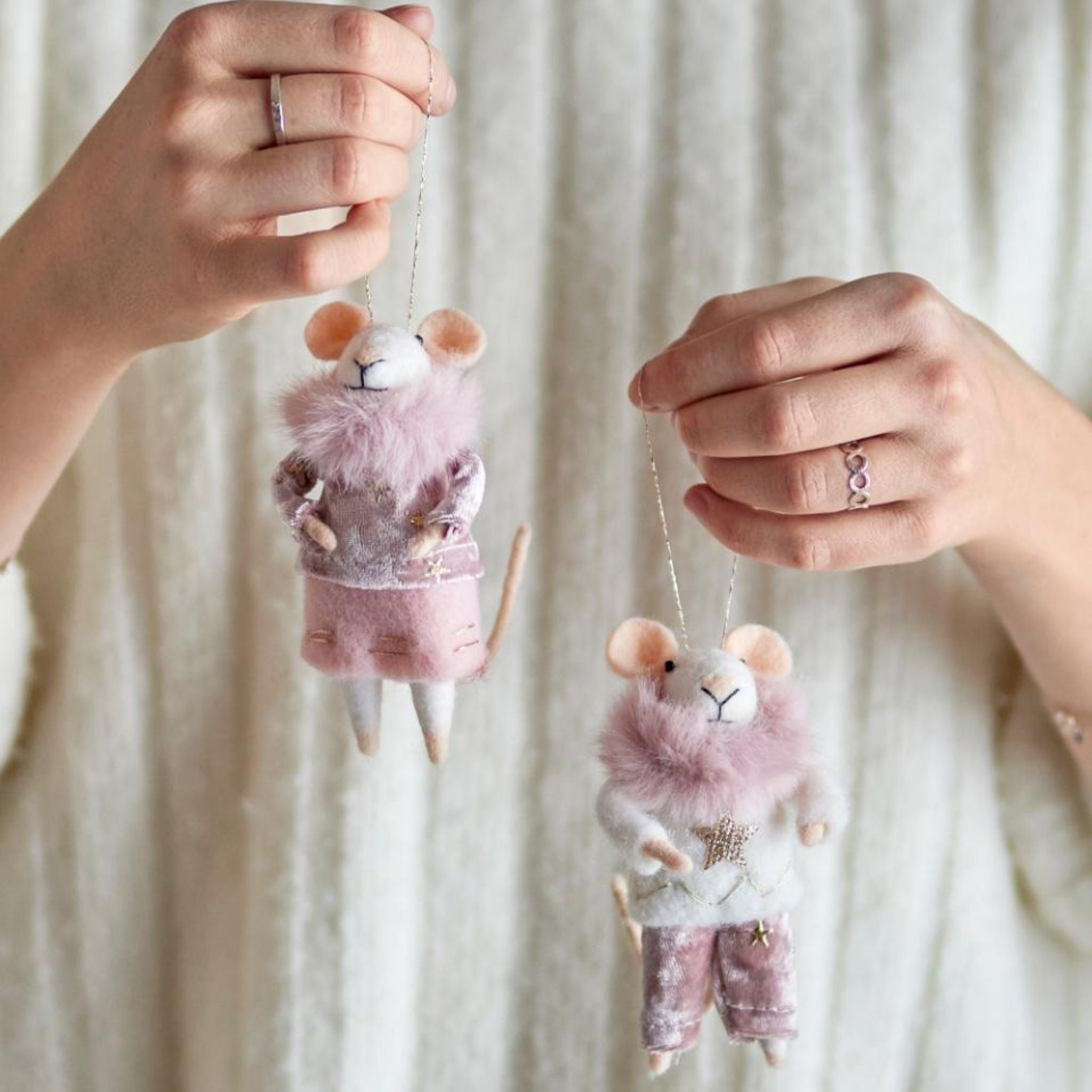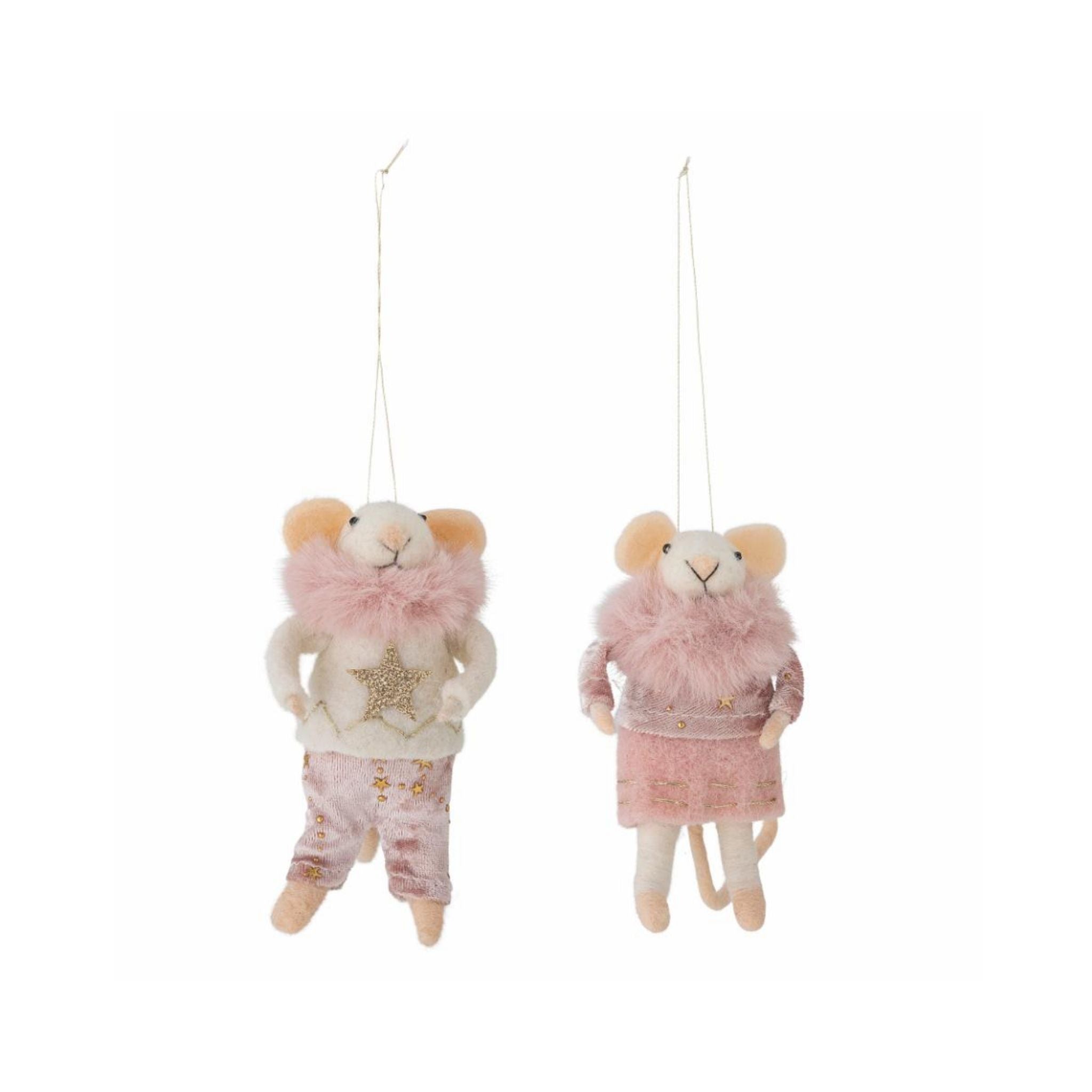Peo Ornamentet fra Bloomingville består af to charmerende mus, filtet i blød uld og pyntet med festlige detaljer. Deres legende outfits skaber en hyggelig og munter stemning i juledekorationen. Med den gyldne ophængssnor er de nemme at hænge på juletræet eller integrere i en større dekoration, hvor de tilfører et sjovt og livligt element.