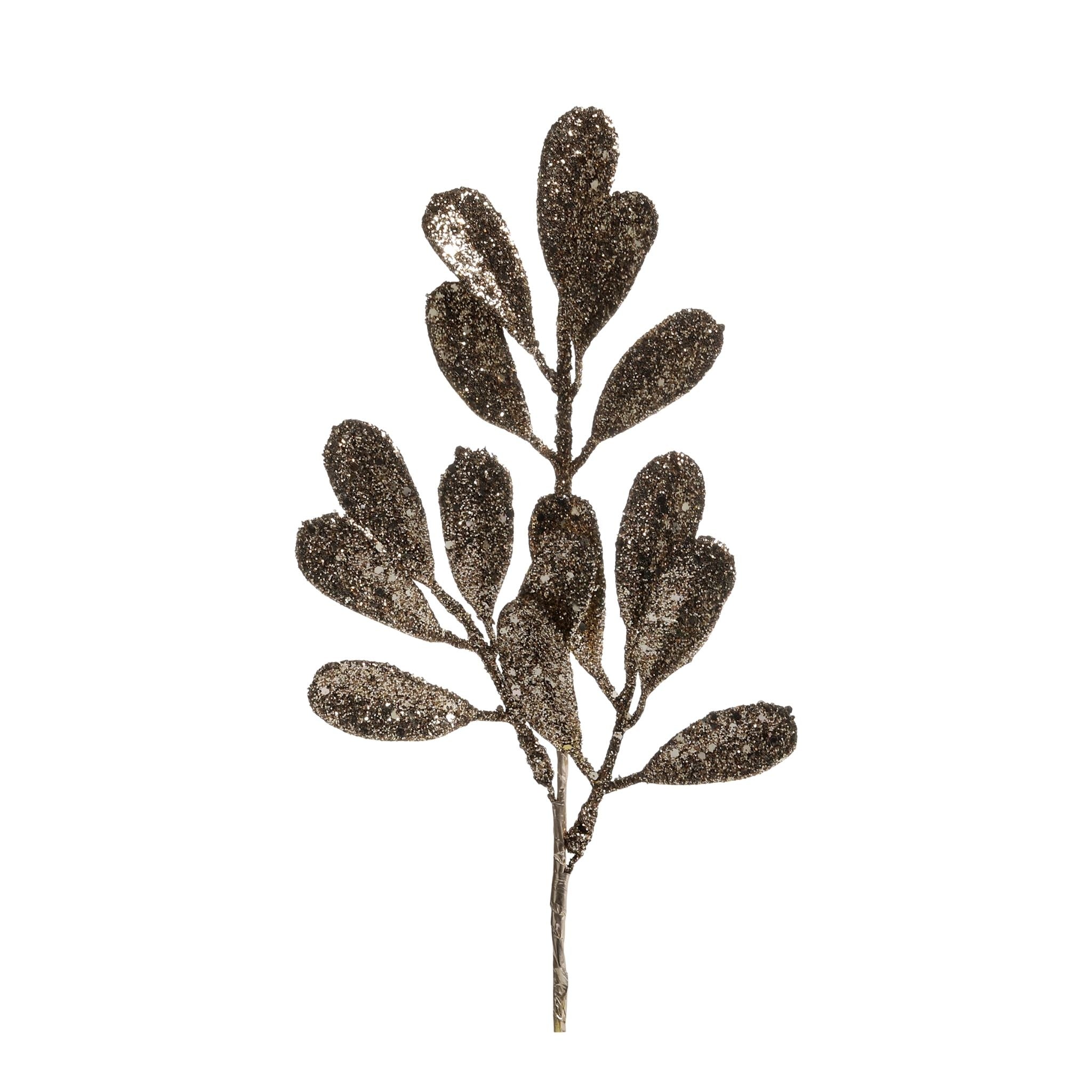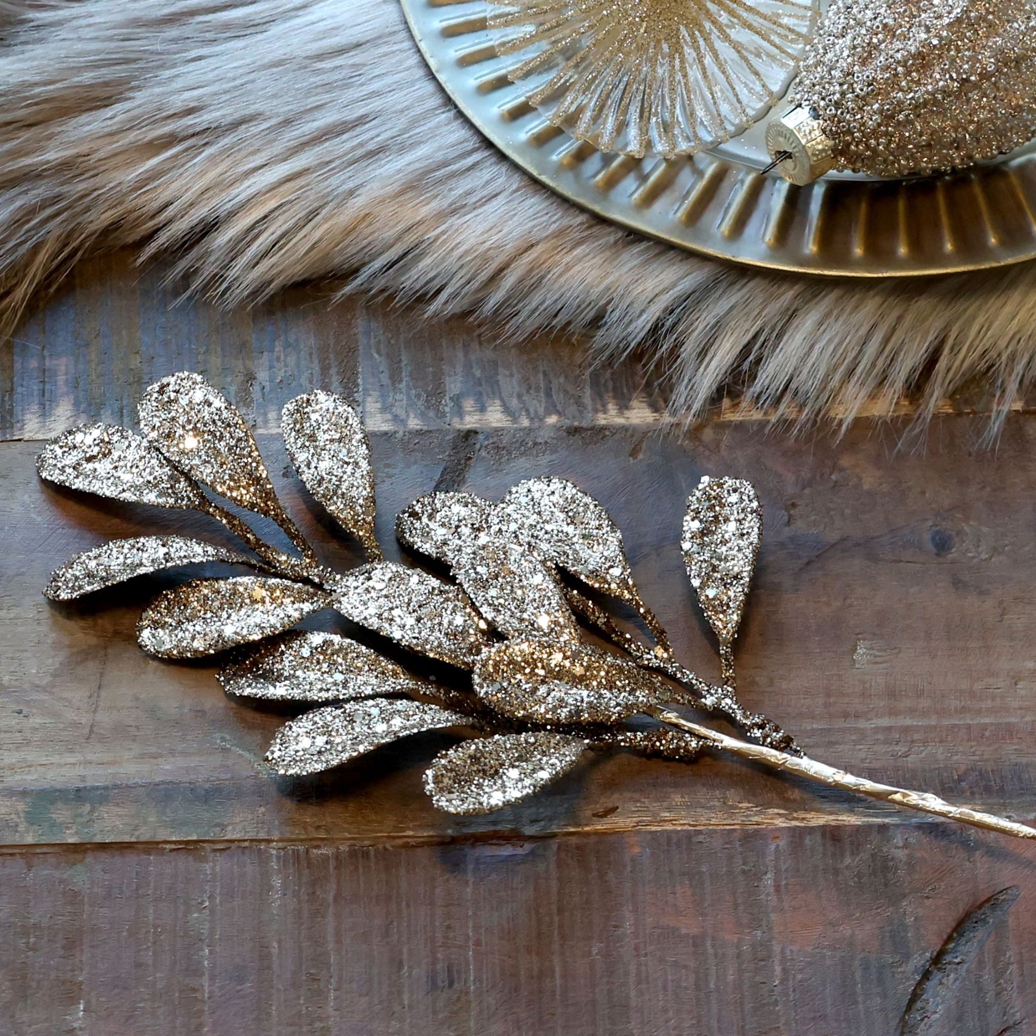 Fin lille fleur gren med blade og glimmer, perfekt til opdækning af jule- eller nytårsbordet. Du kan også sammensætte flere grene i en flot vase, eller bruge dem som en del af din juletræspynt.