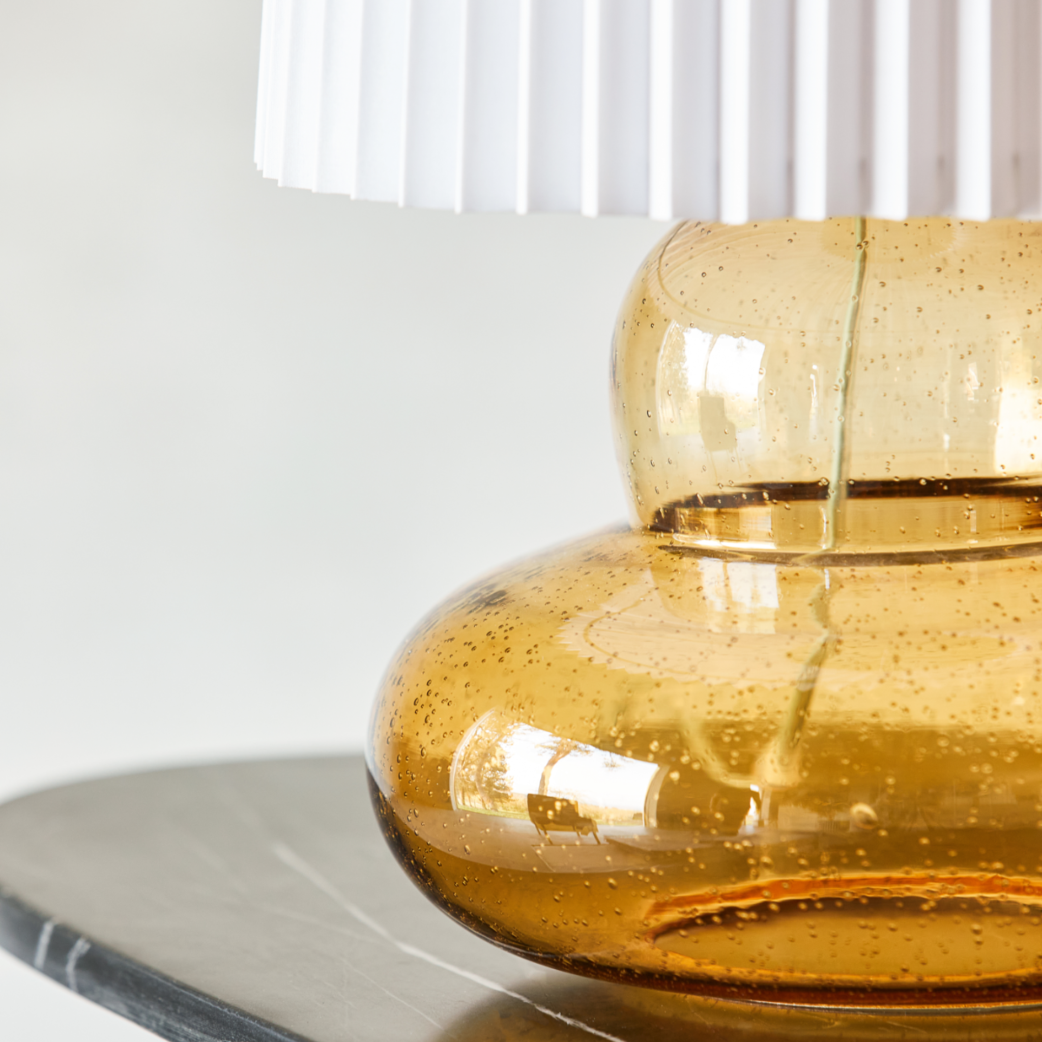 Opgrader din indretning med Ribe-bordlampen, der forener en elegant glasfod med en tidløs plisséskærm. Når lyset filtreres gennem den hvide skærm, skaber det en blød og hyggelig belysning, mens den varme orange fod tilfører rummet en behagelig glød. De fine luftbobler i glasset giver designet et let og unikt udtryk. Uanset placering tilfører Ribe-lampen stemning og et strejf af nostalgisk charme.