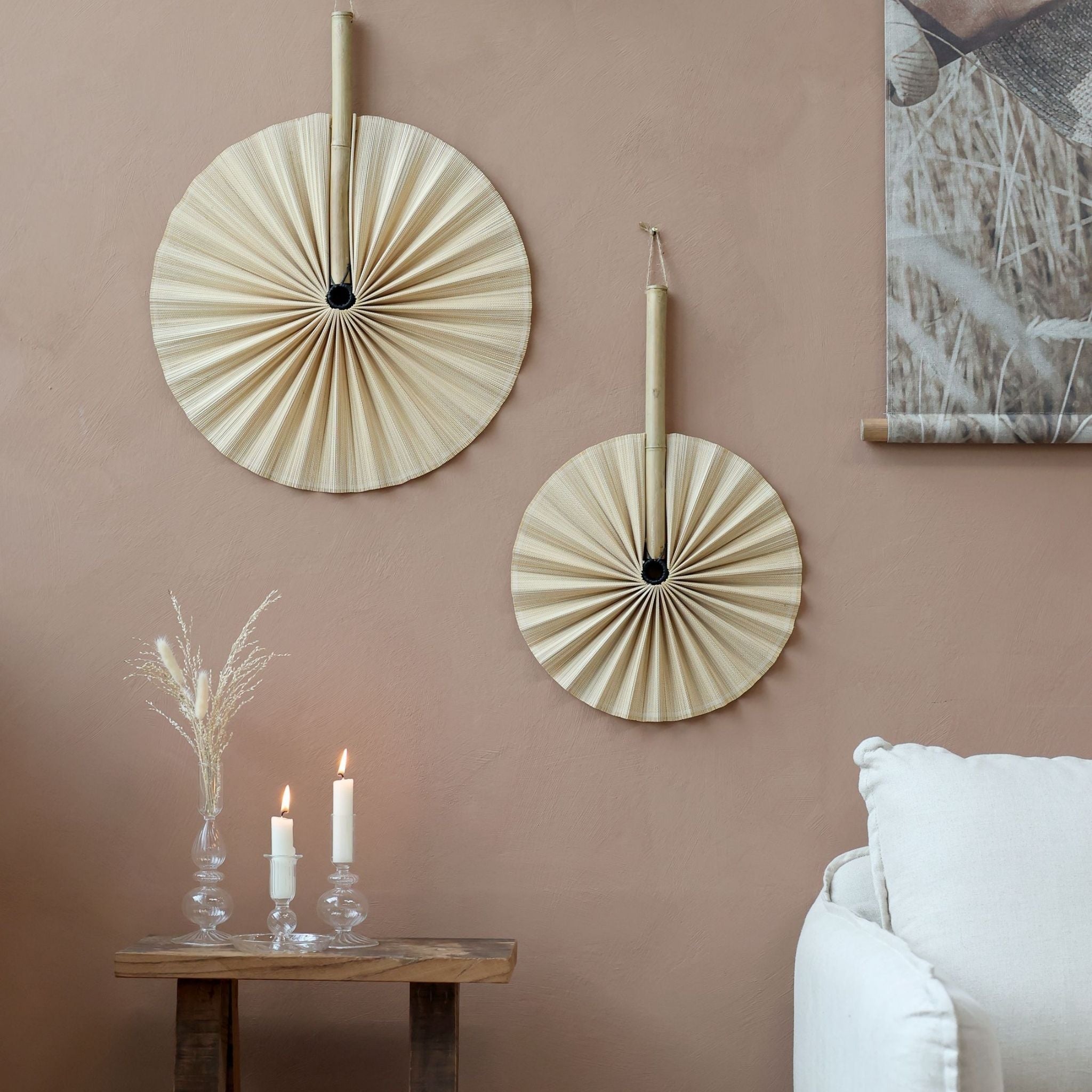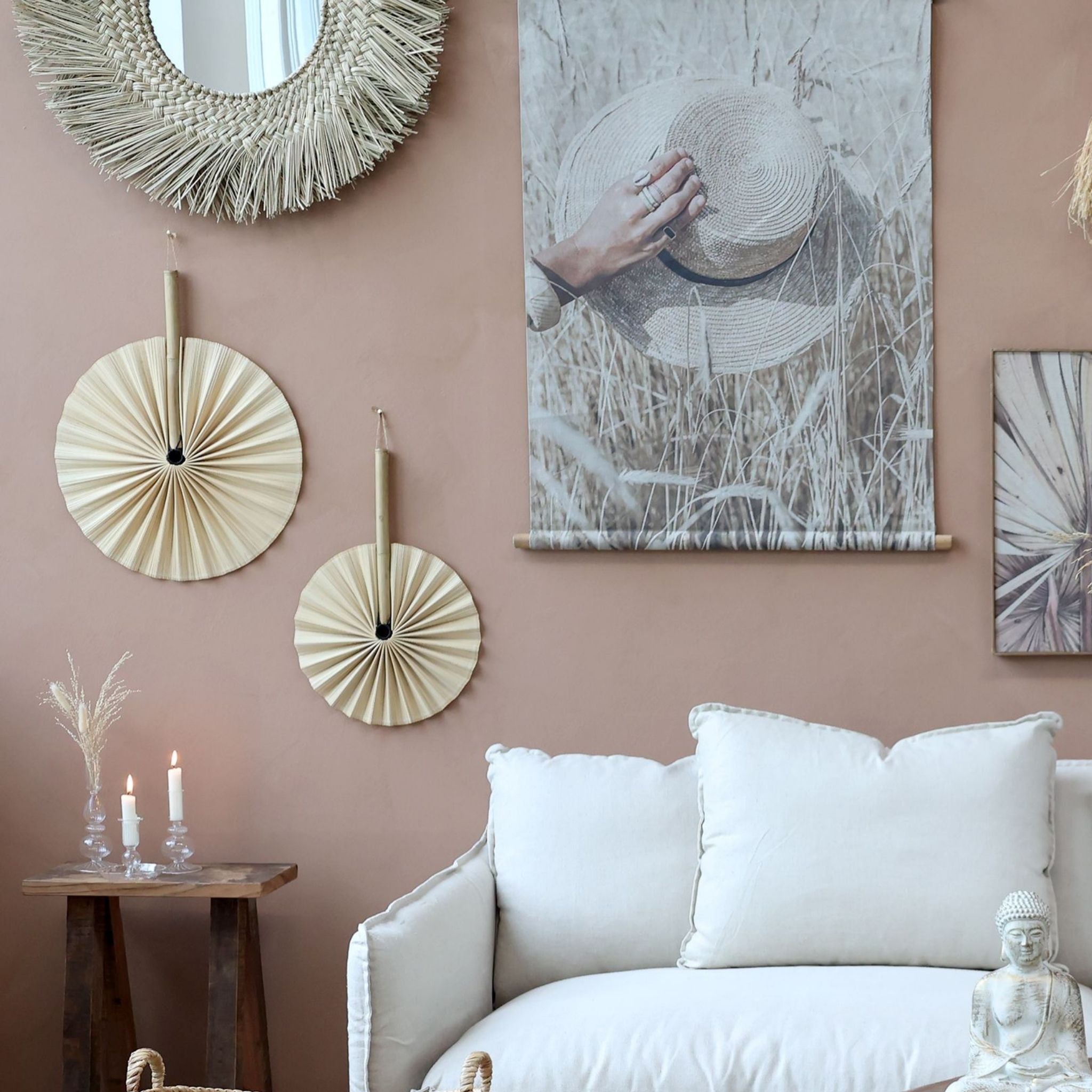Hæng viften på væggen som et unikt statement piece eller kombiner den med andre vægdekorationer for et spændende, boheme-inspireret udtryk.
