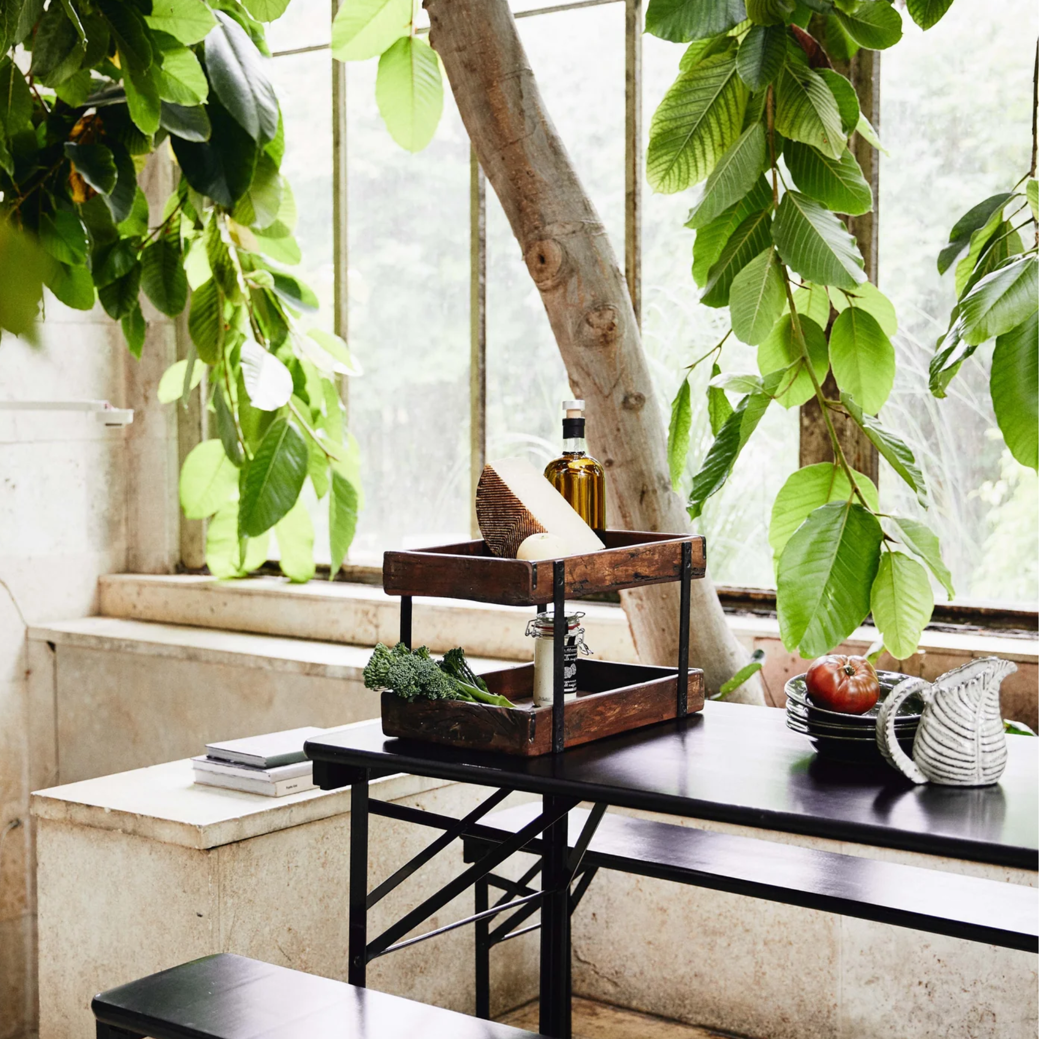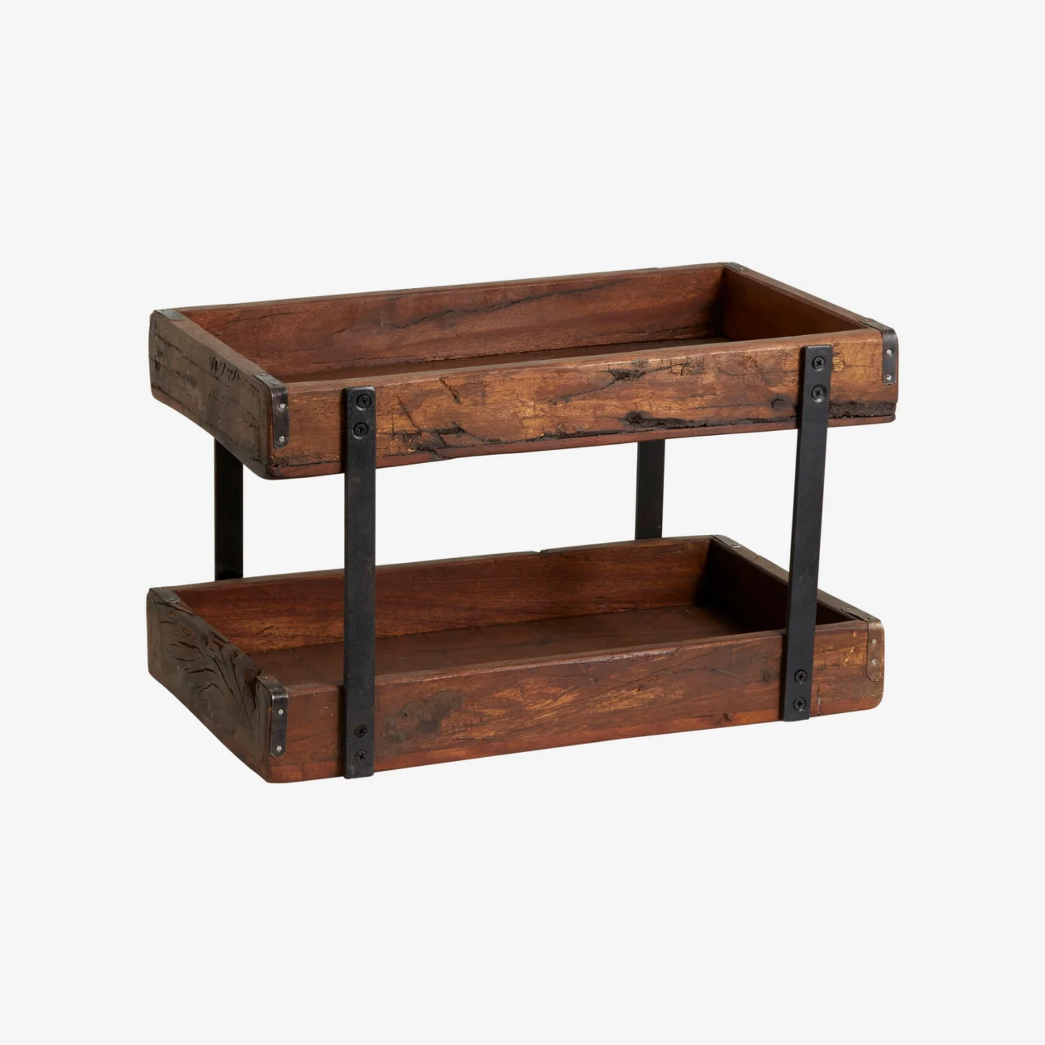Dette bakke display er et unikt produkt, håndlavet af genbrugstræ fra Indien.