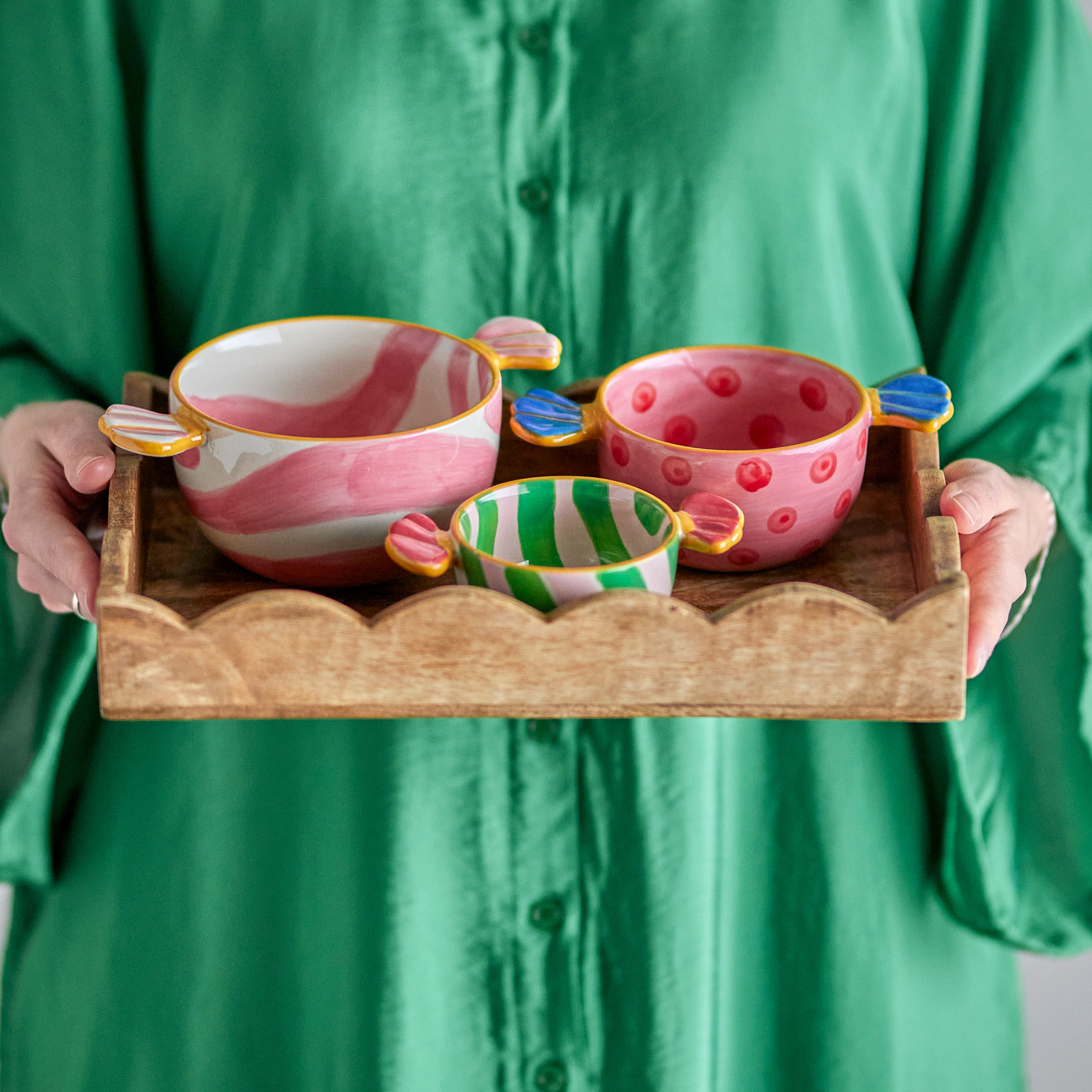 Caramella skålsættet fra Bloomingville er en charmerende og legesyg tilføjelse til bordet – perfekt til alt fra nødder til frugt.