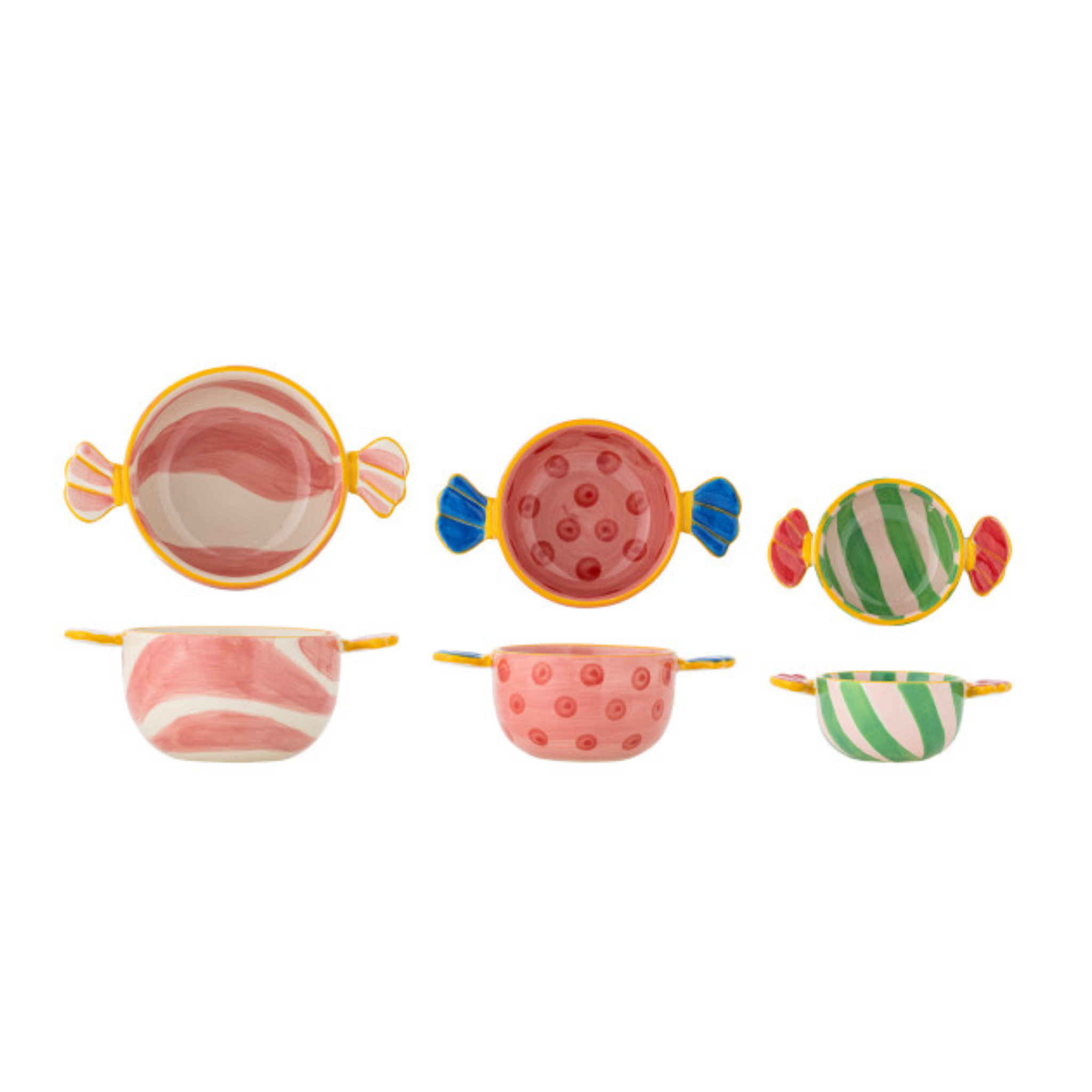 Den slik-inspirerede form med praktiske håndtag kombinerer sjovt design med funktionalitet. Fremstillet i holdbart stentøj tåler skålene både hverdagsbrug og festlige lejligheder. Caramella-skålene bringer glæde og humor til enhver servering – selv de enkleste snacks får et festligt twist.