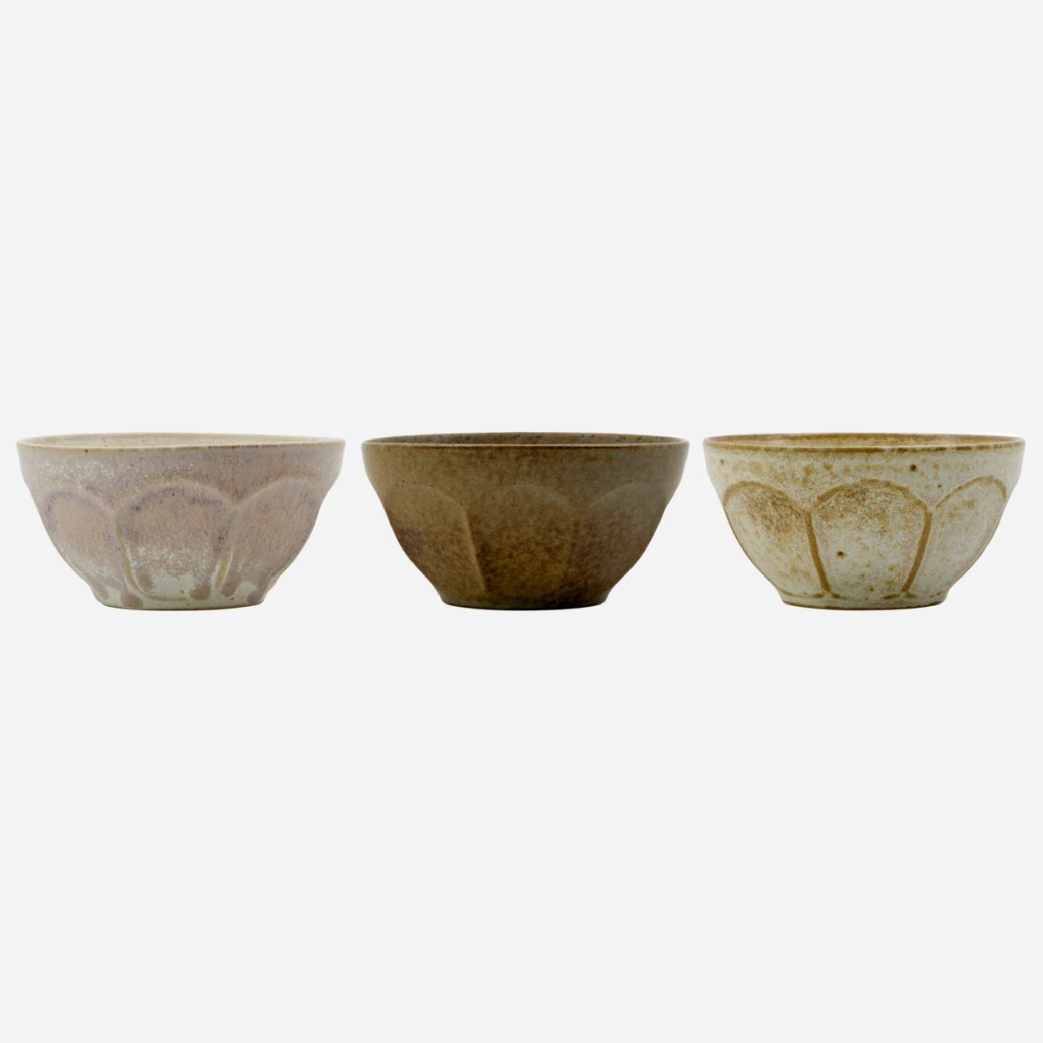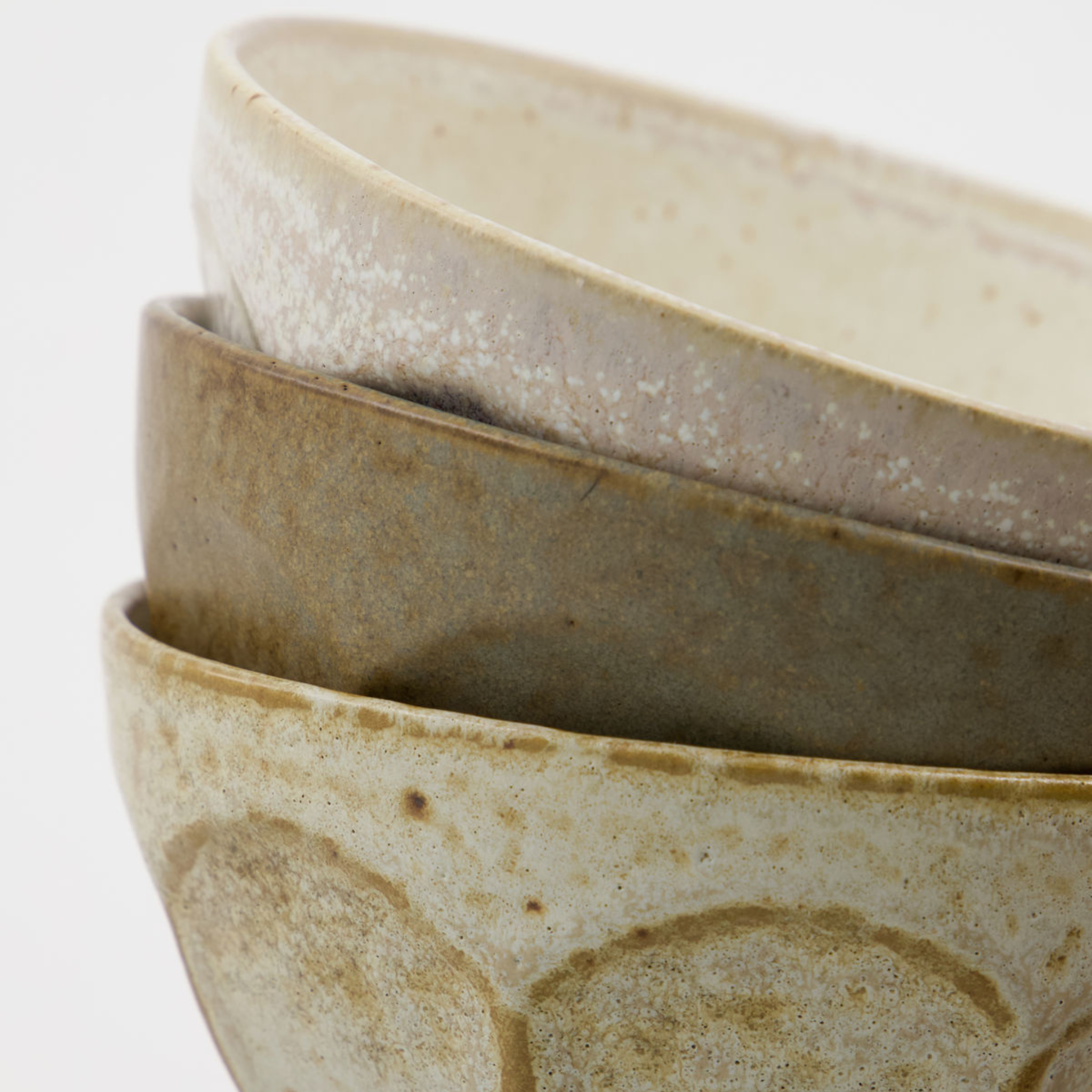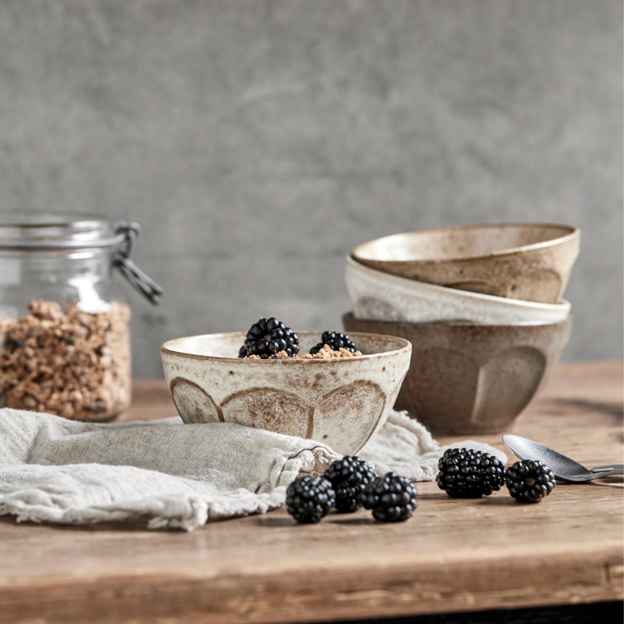 Hver skål er håndlavet i stentøj og har unikke designvariationer, der forstærker charmen. Fås i off-white, beige og grøn og udgør en sofistikeret farvepalet til din borddækning.