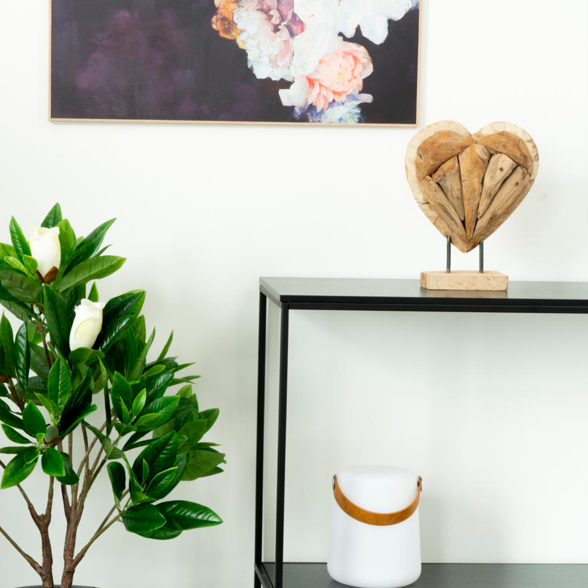 Dekorations hjerte i teaktræ. Flot dekoration i hjemmet, klinikken, kontoret eller hvor der mangler lidt anderledes dekoration og samtidig bringe naturen ind. Det flotte skåret hjerte er 30 cm højt, på træ fod.