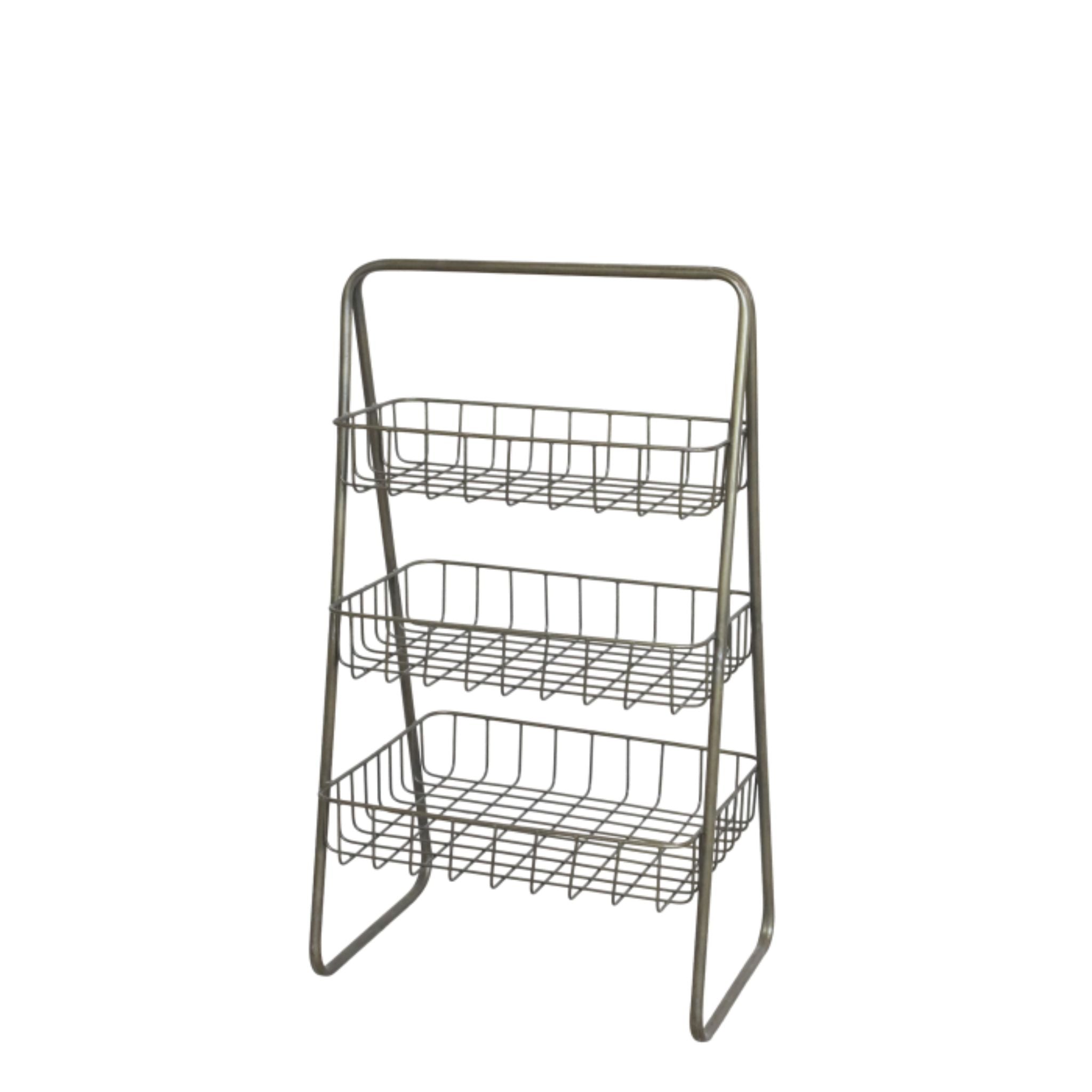 Smuk og praktisk etagere i jern med tre trådkurve, perfekt til opbevaring og dekoration i hjemmet. Den varme antik messingfarve giver et klassisk og tidløst look, mens de åbne kurve skaber et let og luftigt udtryk. Ideel til køkkenet, badeværelset eller stuen, hvor både funktionalitet og stil er i fokus.