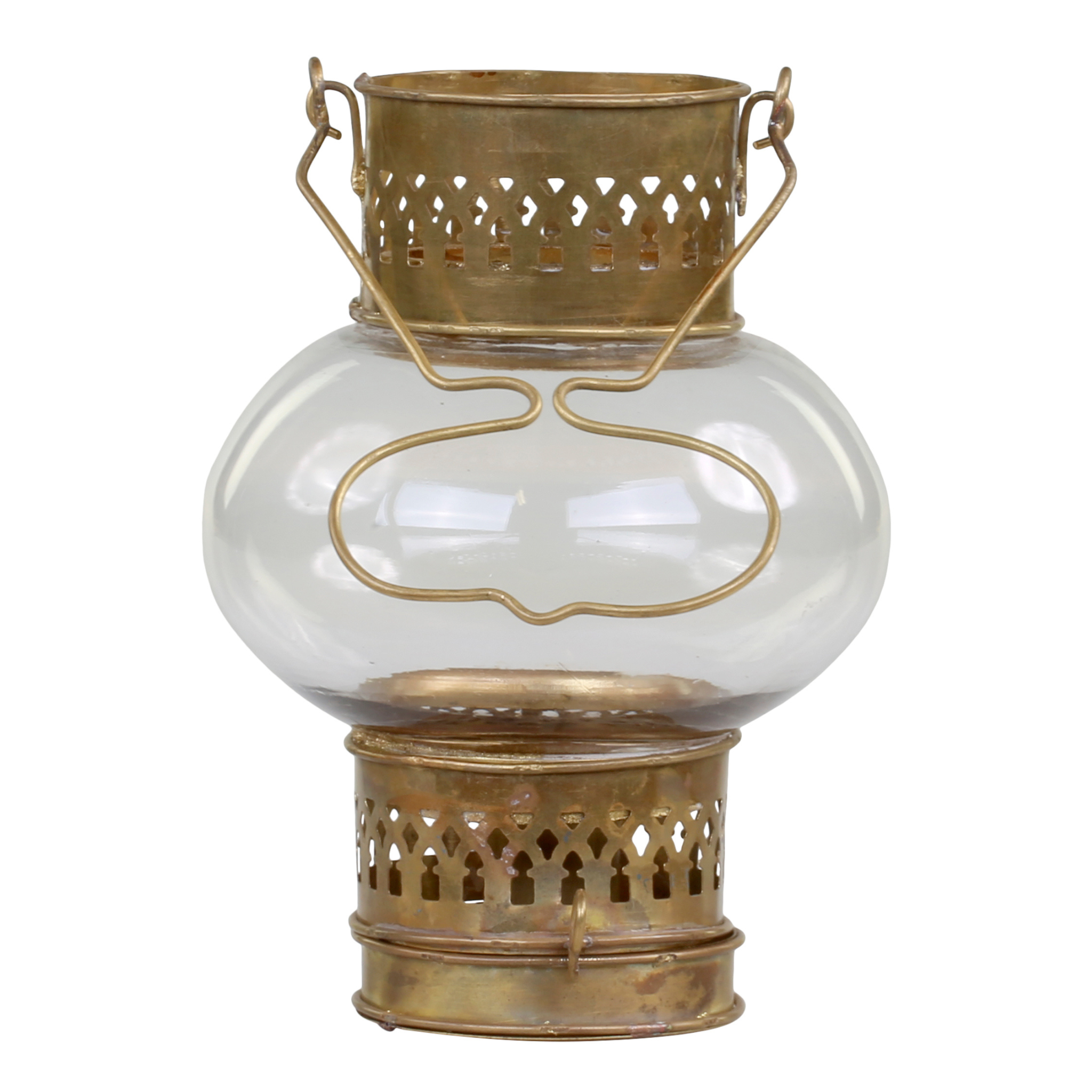 Denne elegante lanterne er det perfekte valg, når du vil skabe en hyggelig stemning både inde eller ude. Lanternen har en rund glaskuppel i midten, hvor du tydeligt kan se det fine bedelys brænde. Top og bund er udført i smuk messingfarvet finish med udskårne detaljer, der giver lanternen et klassisk og dekorativt udtryk. Med det praktiske håndtag kan lanterne både stå på et bord, eller hænges op, alt efter hvor du ønsker at skabe stemning.