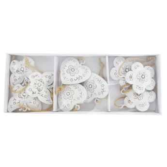 Æske med tre forskellige søde ophæng. Der er 3 blomster, 3 hjerter og 3 sommerfugle i æsken.