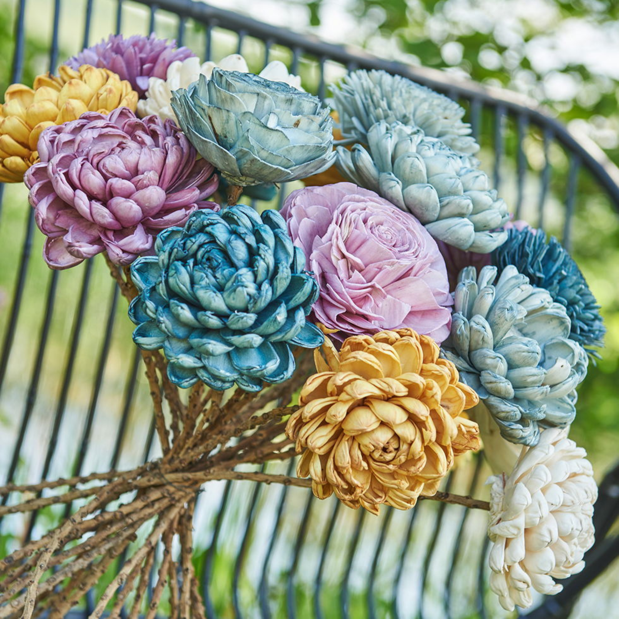 Smukke og dekorative blomster lavet af gul sola wood med stilk.