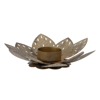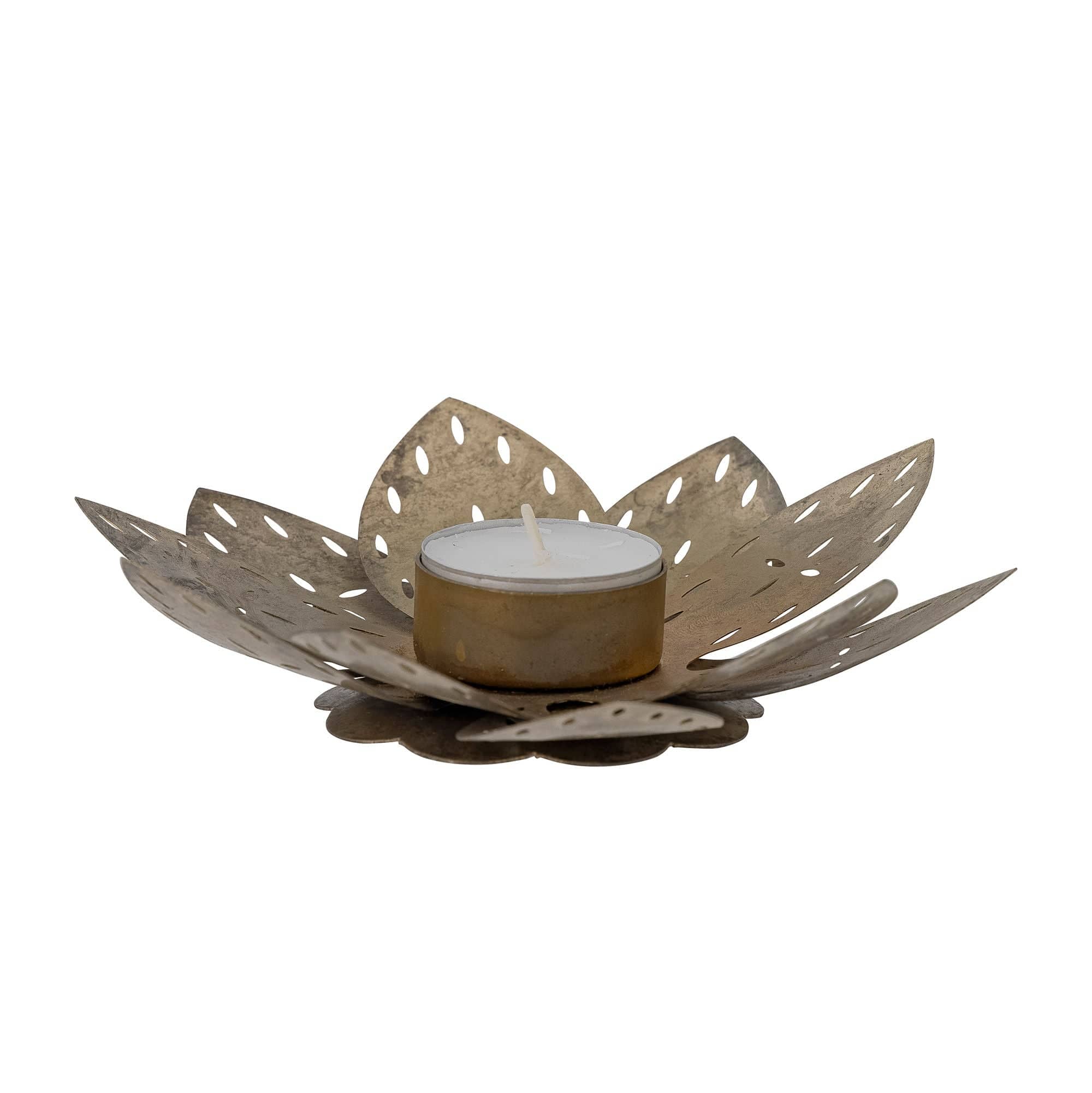 Den er i et bronzefarvet feminint design af blade klar til at holde et stearinlys.