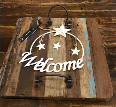 På skiltet er der trykt teksten "welcome" i en elegant skrifttype, der inviterer gæsterne indenfor med varme og venlighed. Under teksten er der afbildet fire smukke stjerner, der symboliserer en velkommen og betydningsfuld oplevelse for dine gæster.