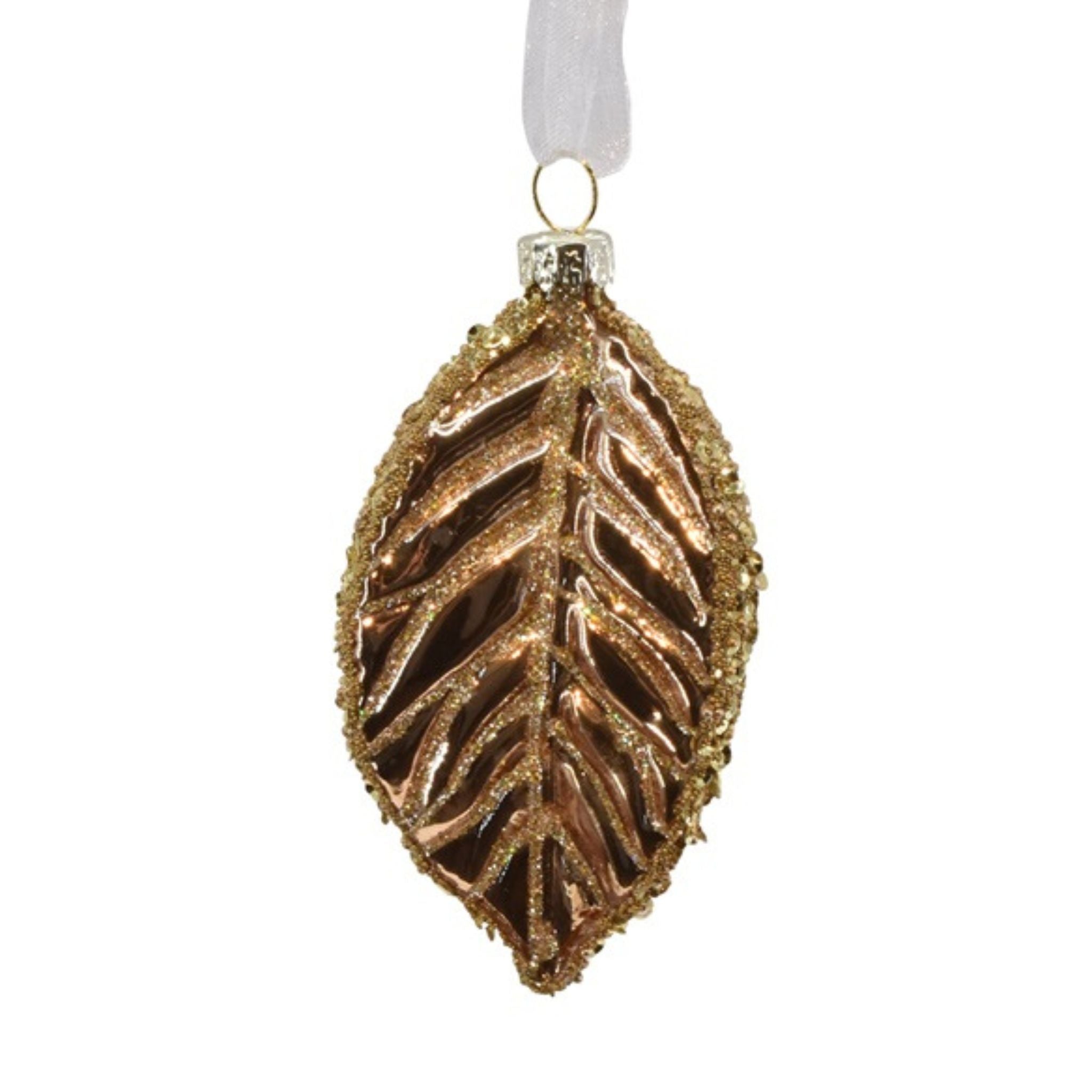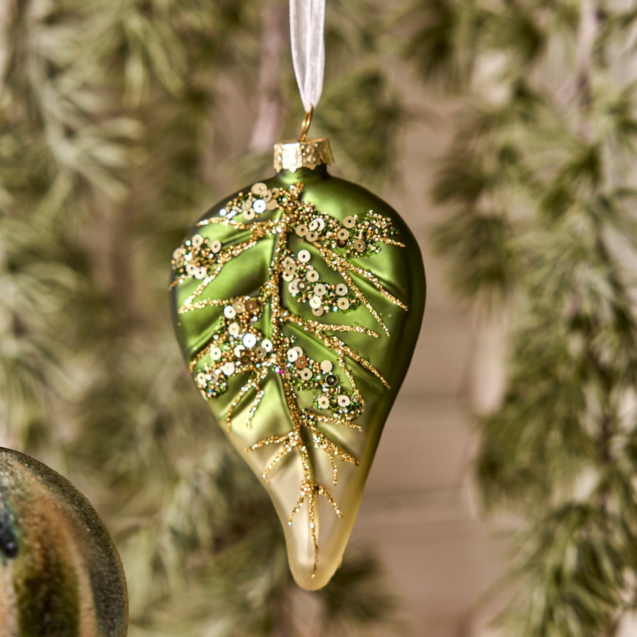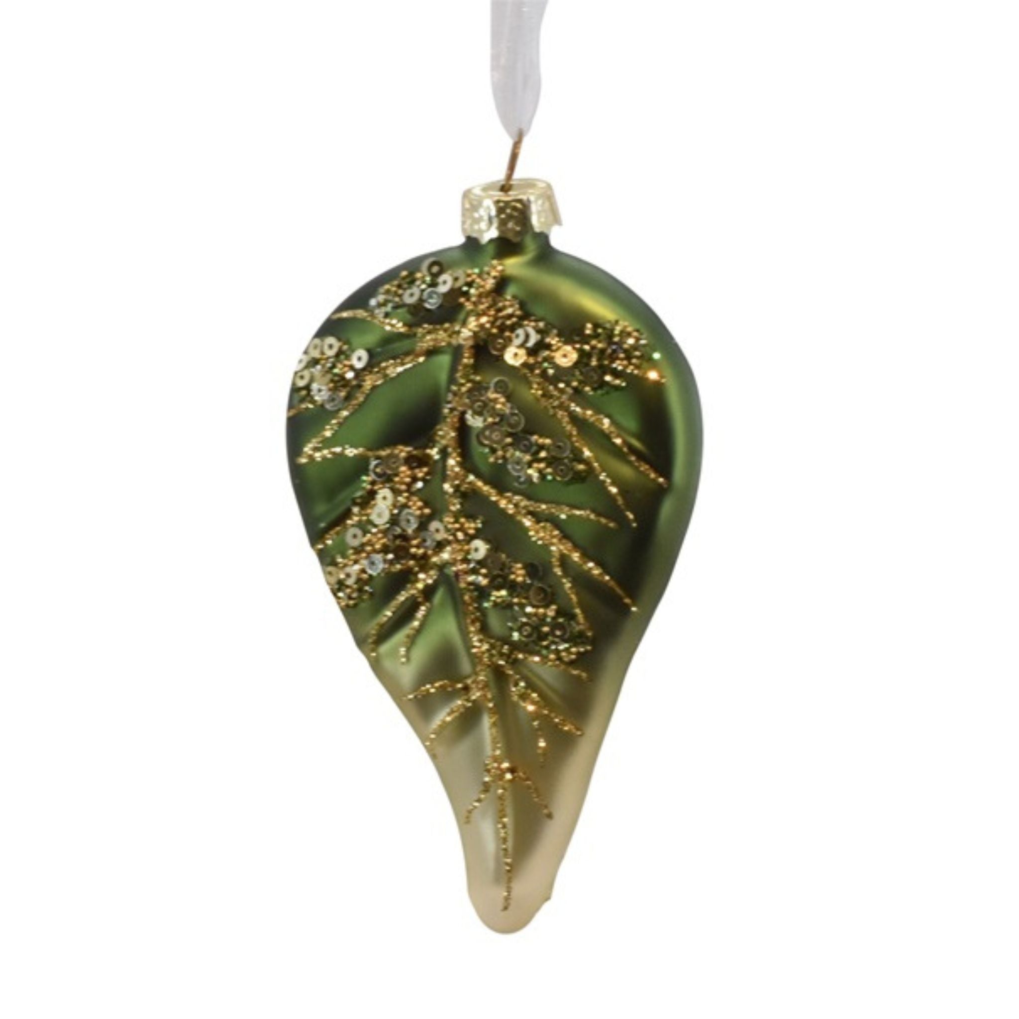 Flotte og unikke julekugler formet som et blad i mørkegrøn eller guld med smukt glitter mønster.