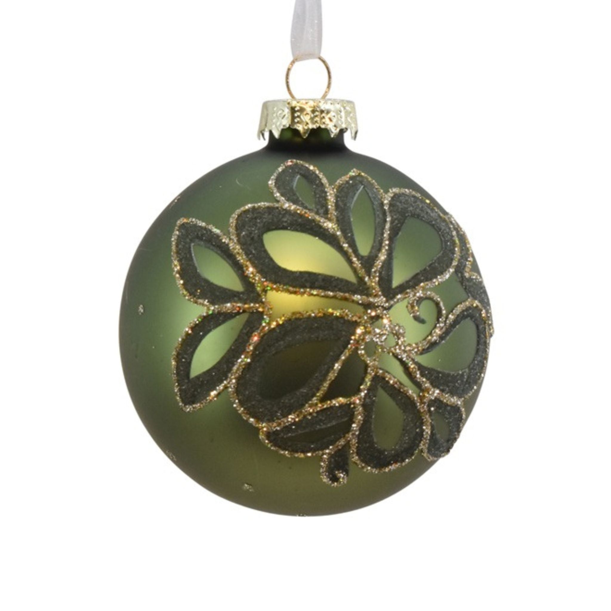 Smuk og dekorativ julekugle i matgrøn med et blomster motiv på siden.