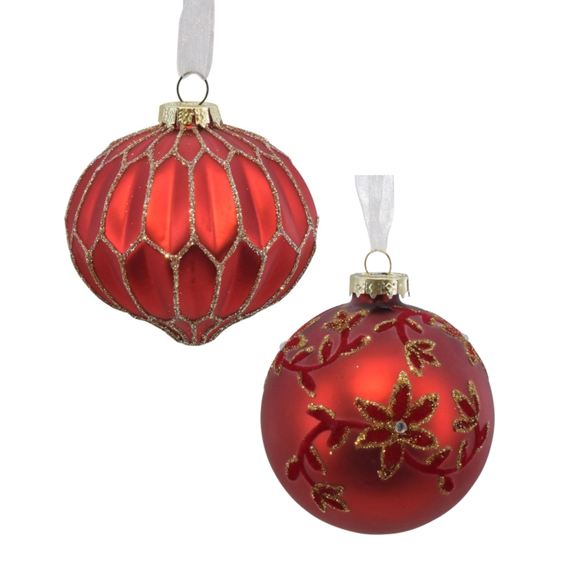 Smukke julekugler i matrød med enten blad motiv eller striber.