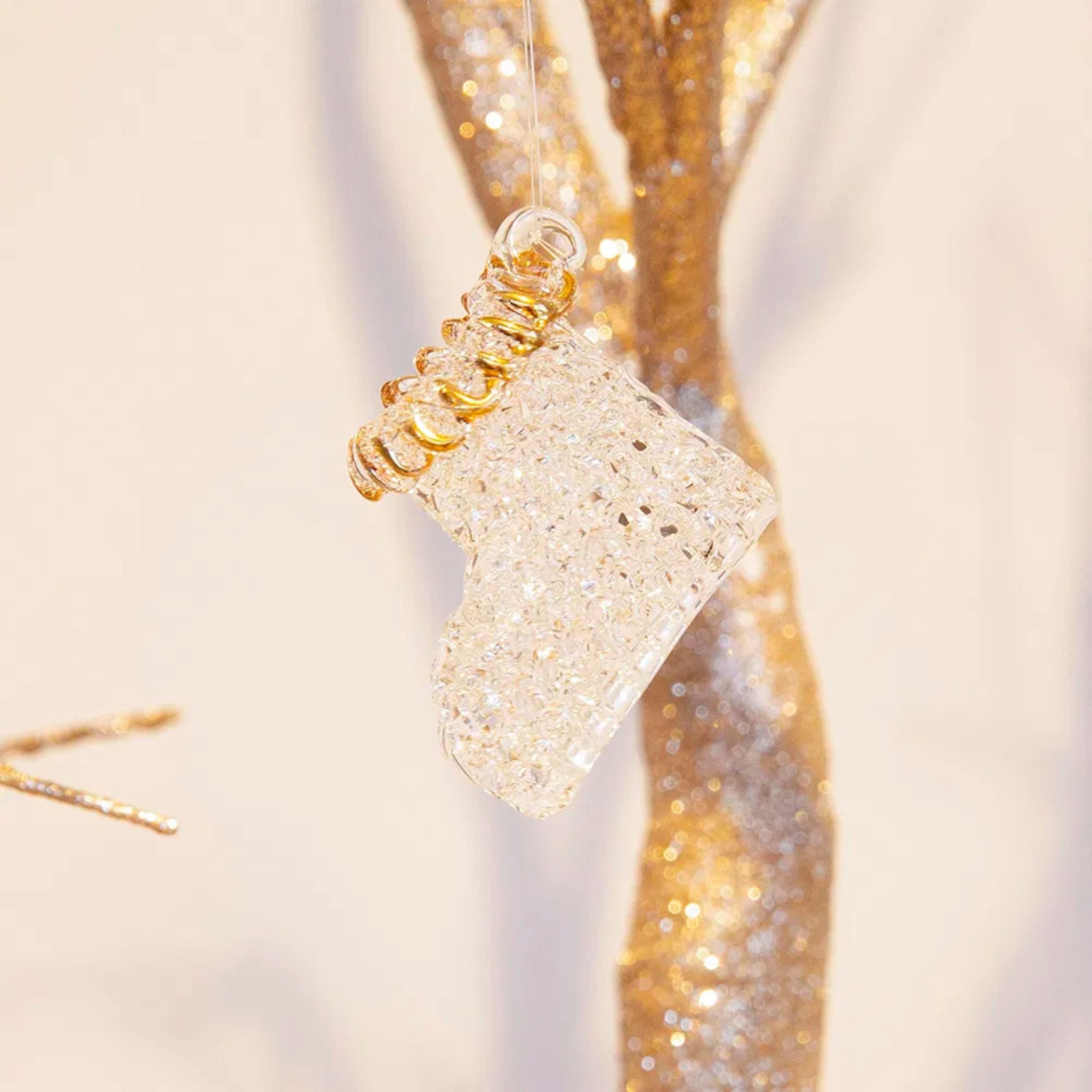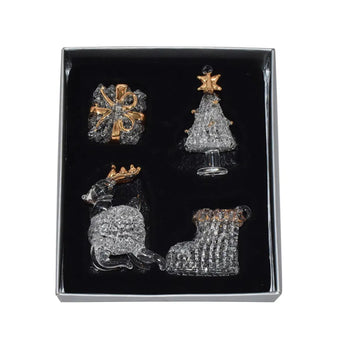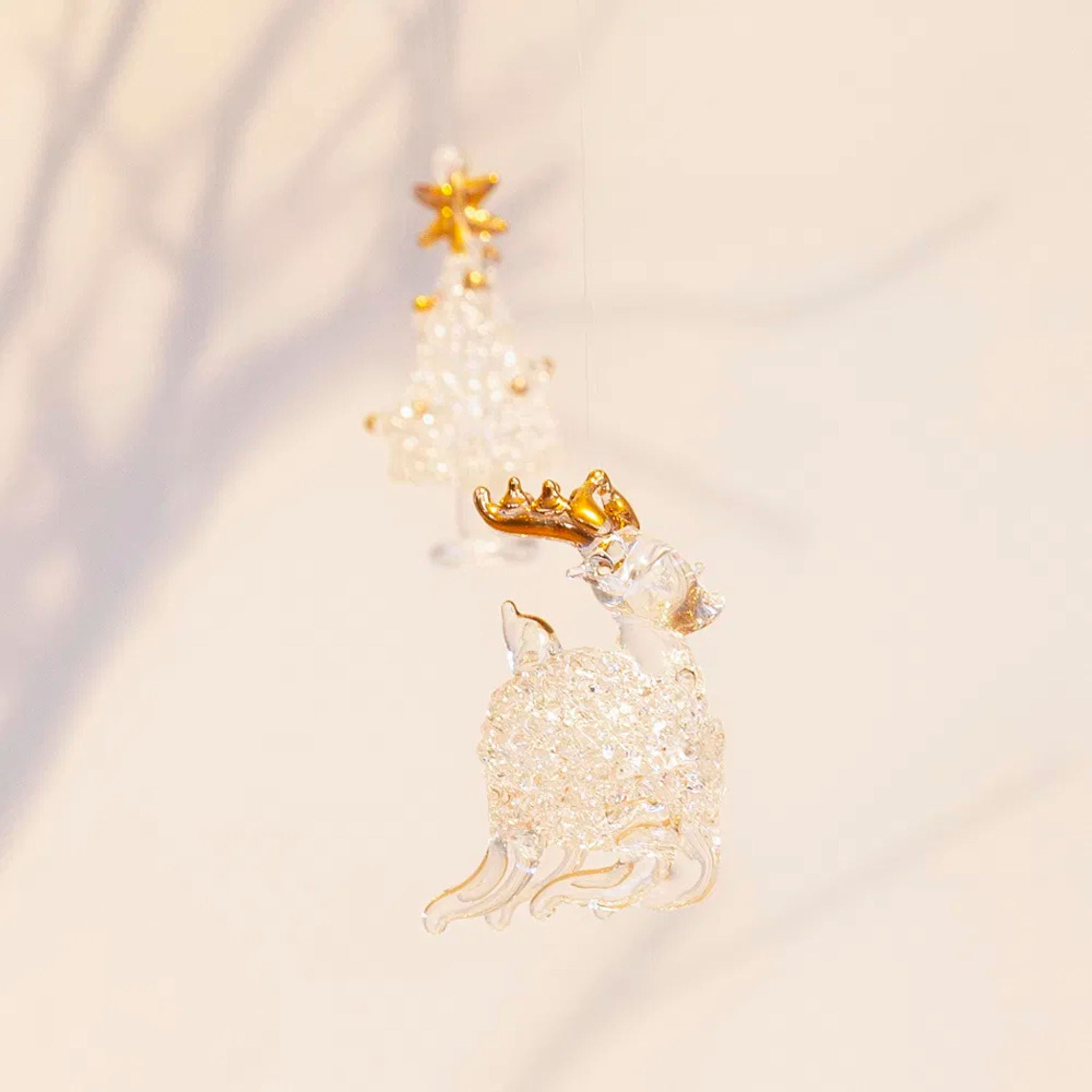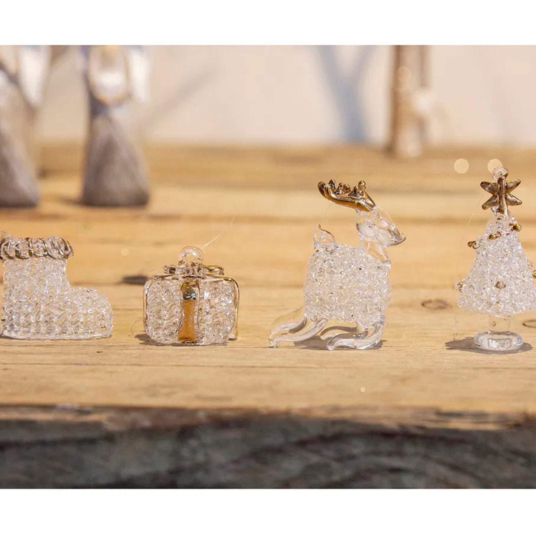 Søde glasophæng til juletræet. Det klare glas giver dem et krystalagtigt look. Hver sæt indeholder 4 stk. som forestiller et juletræ, rensdyr, gave og en støvle.
