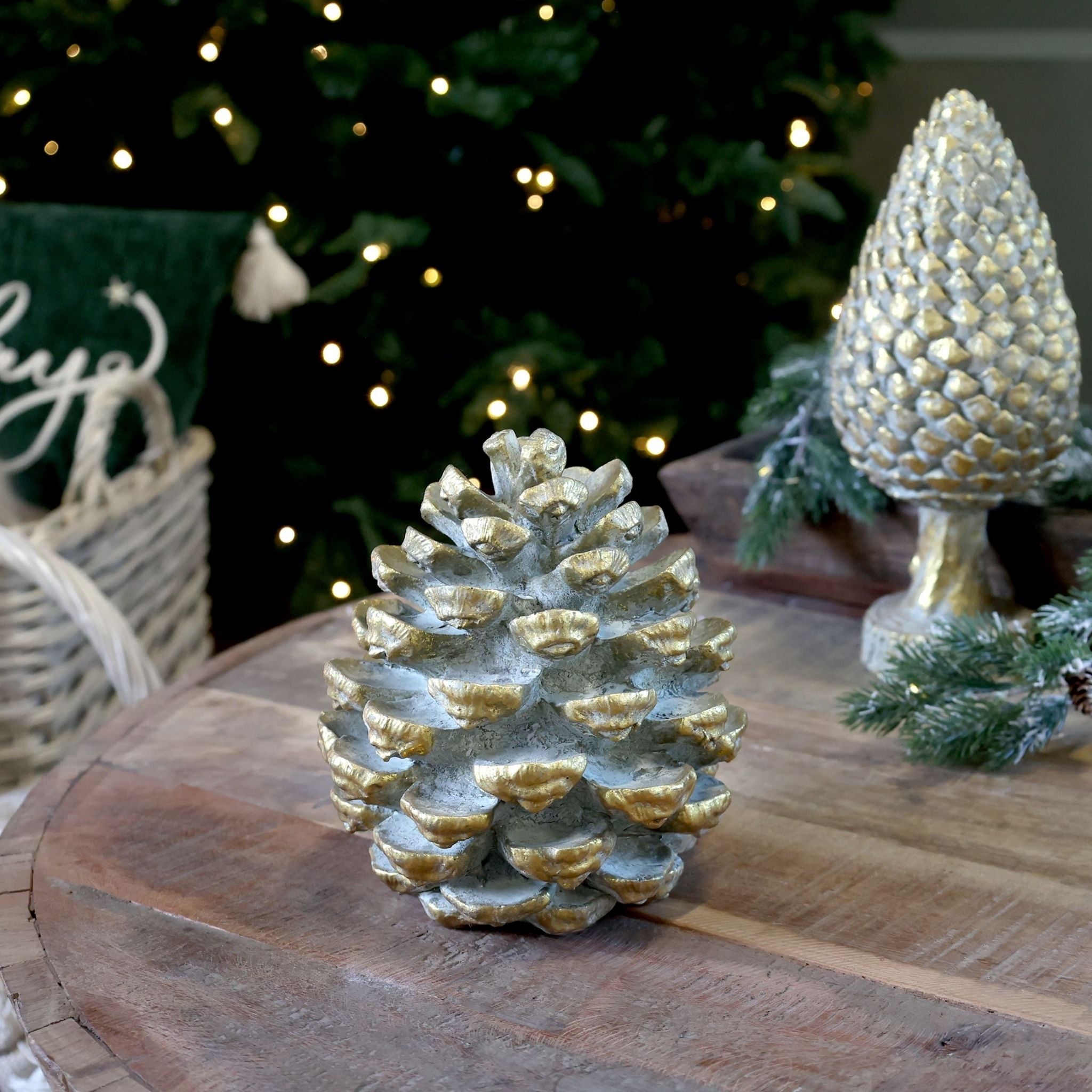 Stor pyntekogle fra Chic Antique. Kan bruges som en del af juledekorationerne, men kan også sagtens pynte hele efteråret og vinteren. Malet i farven antique messing der giver den et antikt og eksklusivt udtryk.