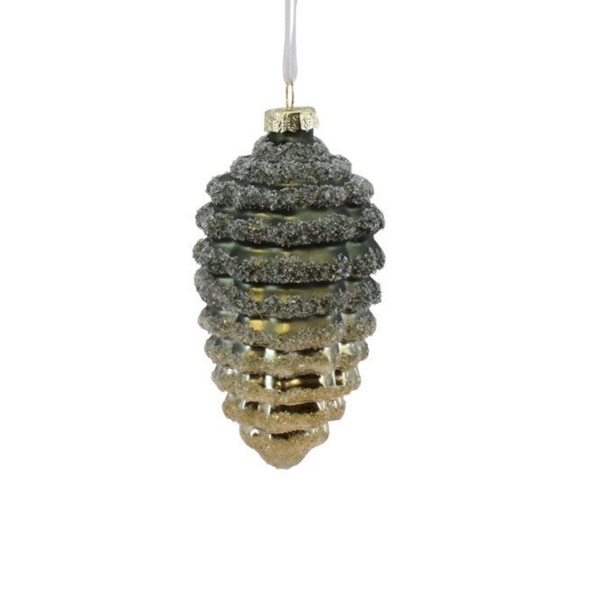 Den grønne kogle i glas med glitrende detaljer er en smuk og dekorativ julepynt, der skaber glans og stemning, når den hænges op.