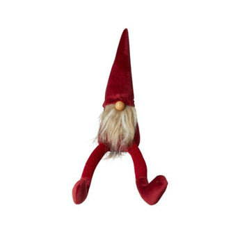 Sød julenisse i rød velour med lange ben, så den kan sidde med benene hængende ud over kanten. Pynt op til jul med disse søde kaj nisser. Fås i flere størrelser, design og farver.