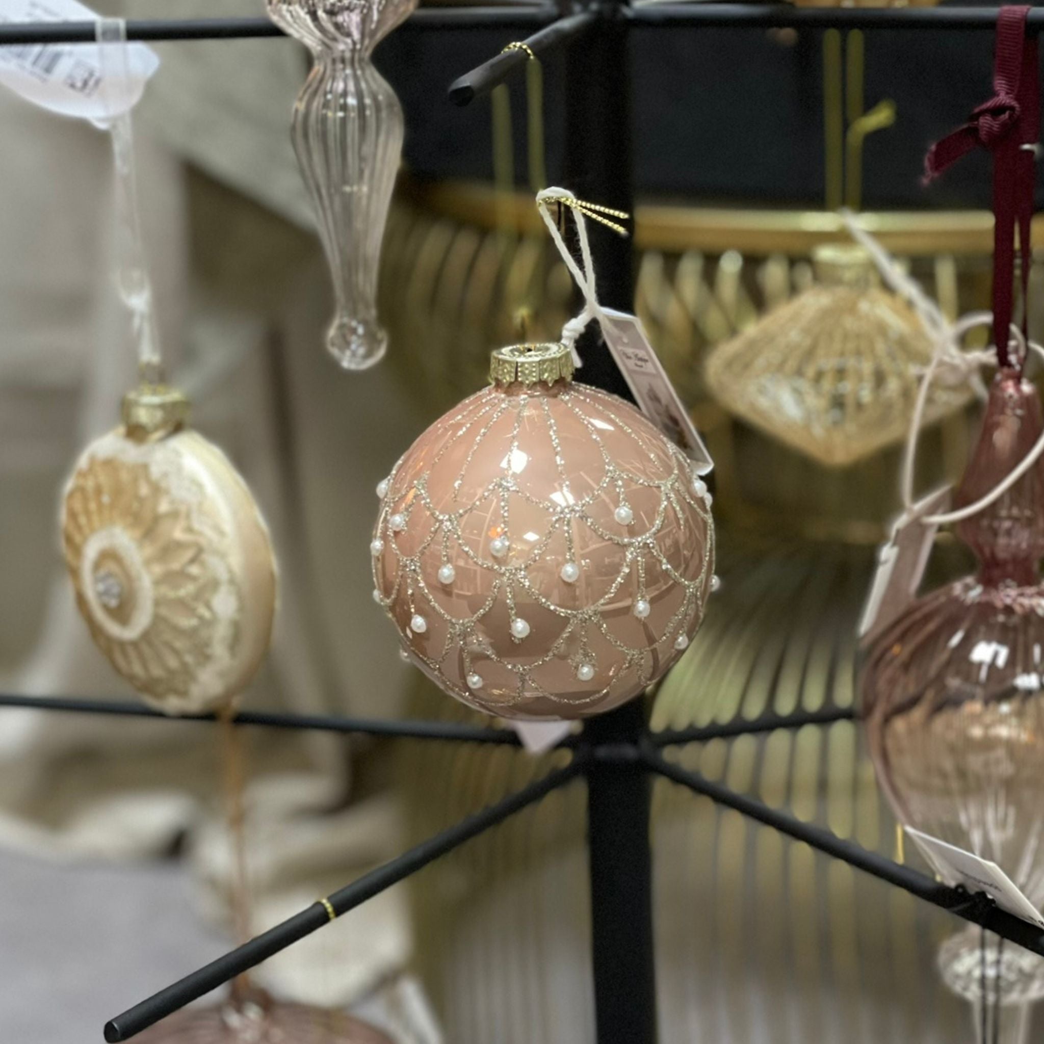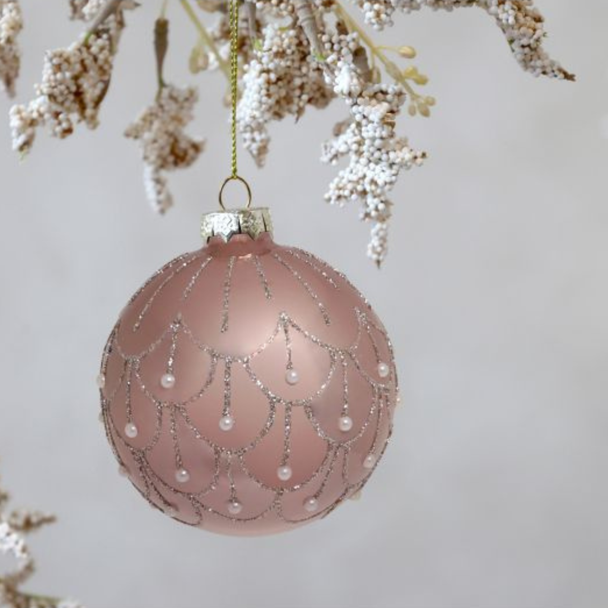 Skab en magisk julestemning med vores smukke rosa julekugle i glas, dekoreret med et strejf af glimmer og delikate perler. Denne julekugle er en perfekt blanding af elegance og festlig charme, der bringer en romantisk glød til dit juletræ.