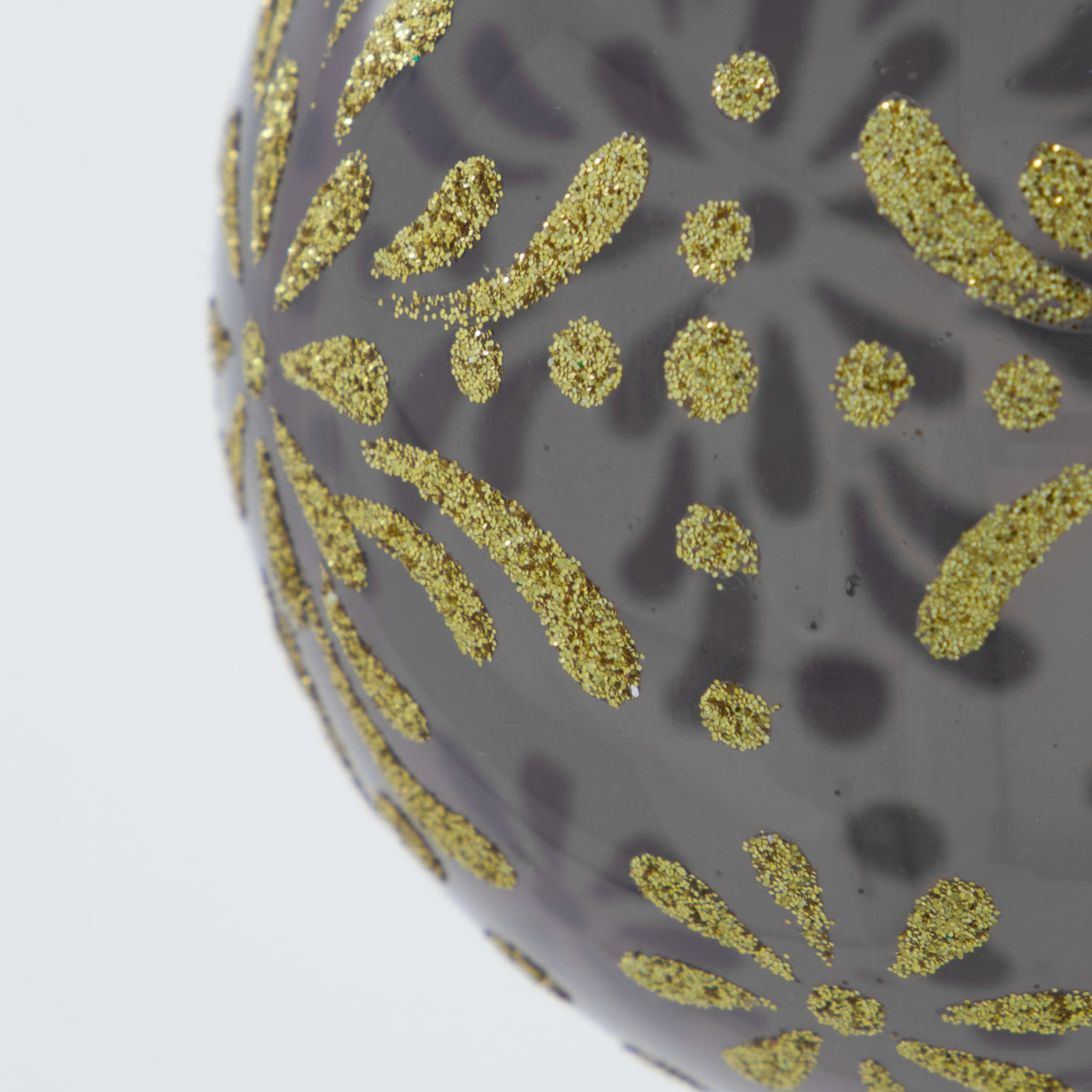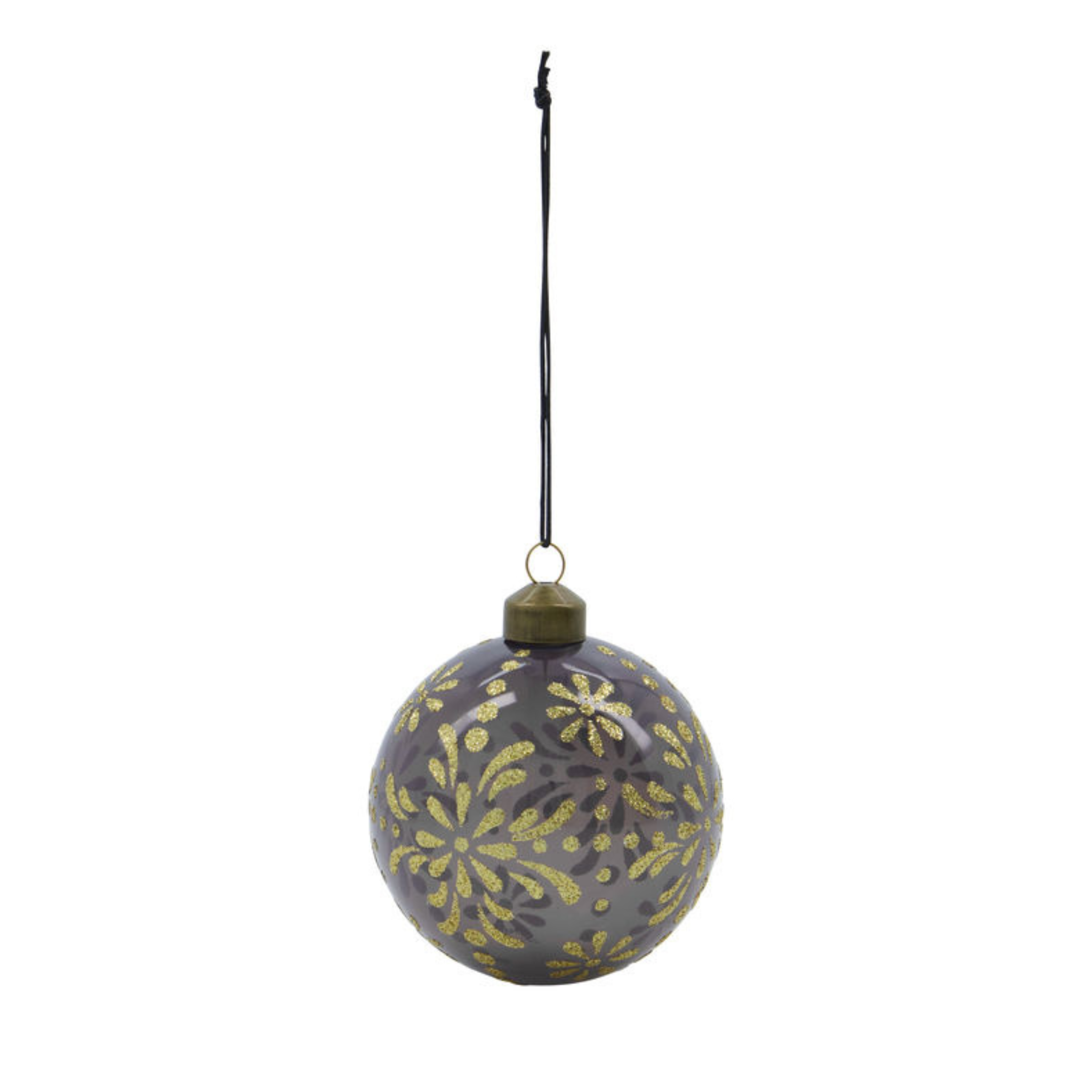 Dens grå farve og gyldne glittermønster skaber en festlig stemning, når den hænger på juletræet eller pynter på dit bord på et fad. På grund af de alsidige farver passer julekuglerne til både brunt, mørkeblåt, guld og glitter.
