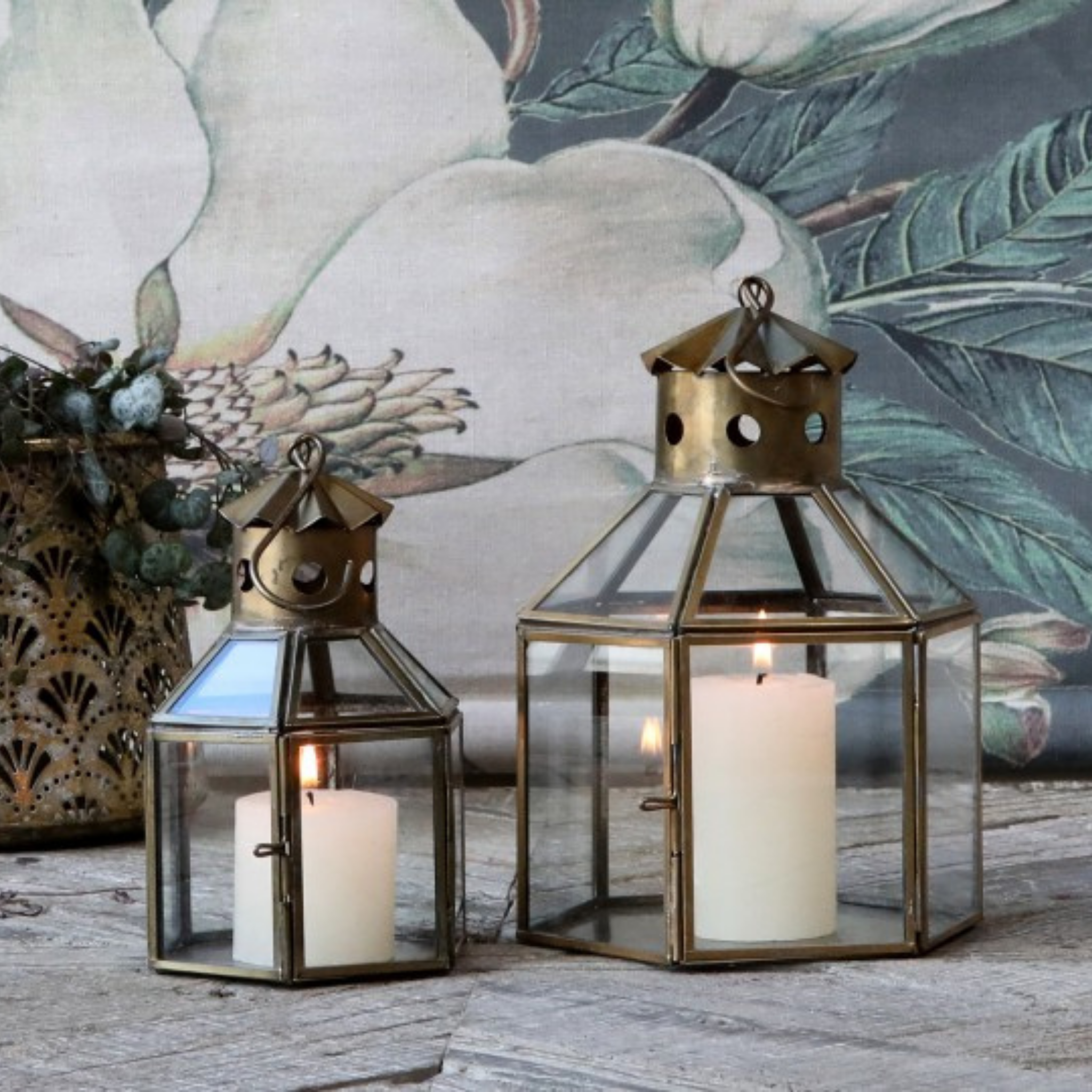 Lanterne med krog antique messing - 2 størrelser