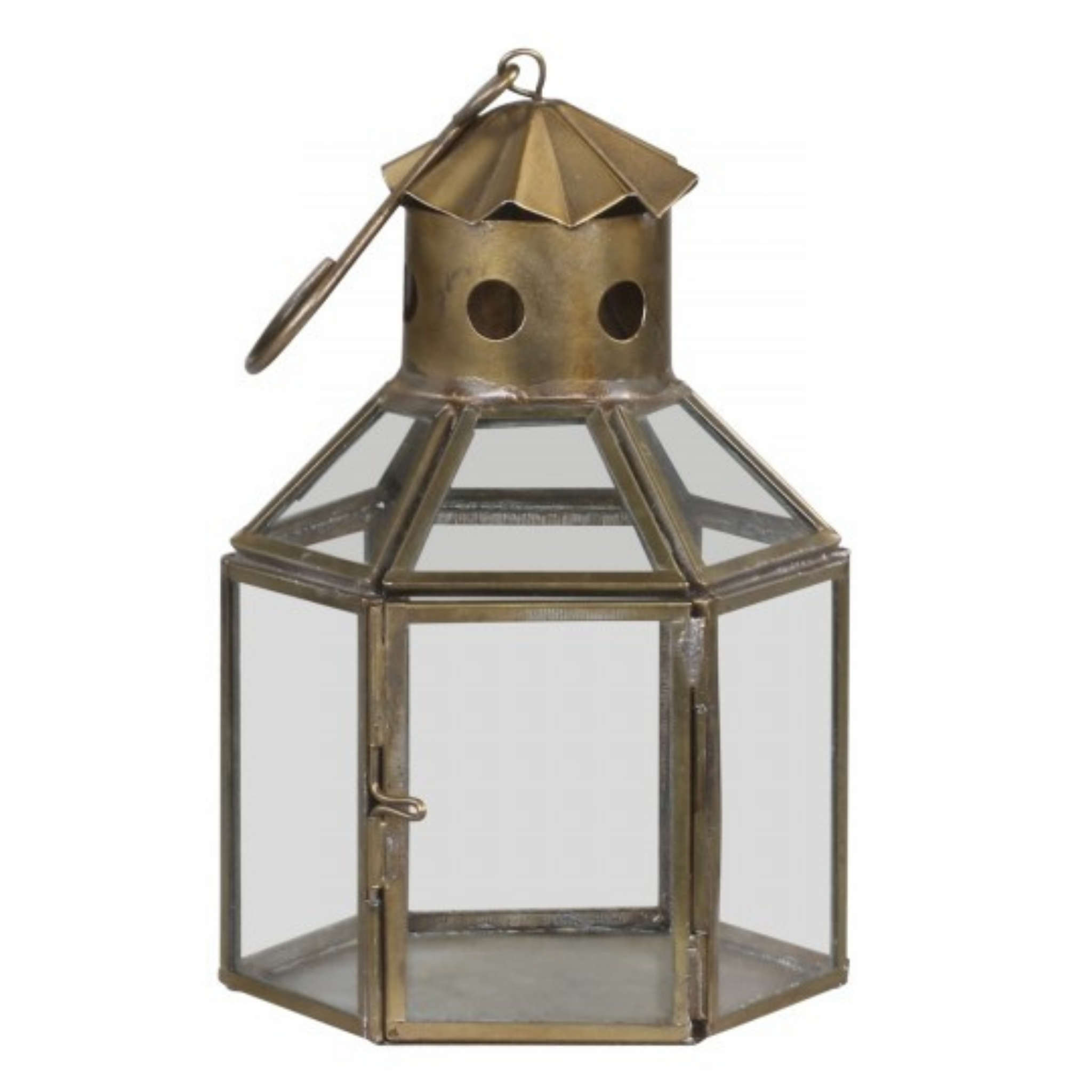 Sød og dekorativ sekskantet lanterne med krog til ophæng i Antique messing.