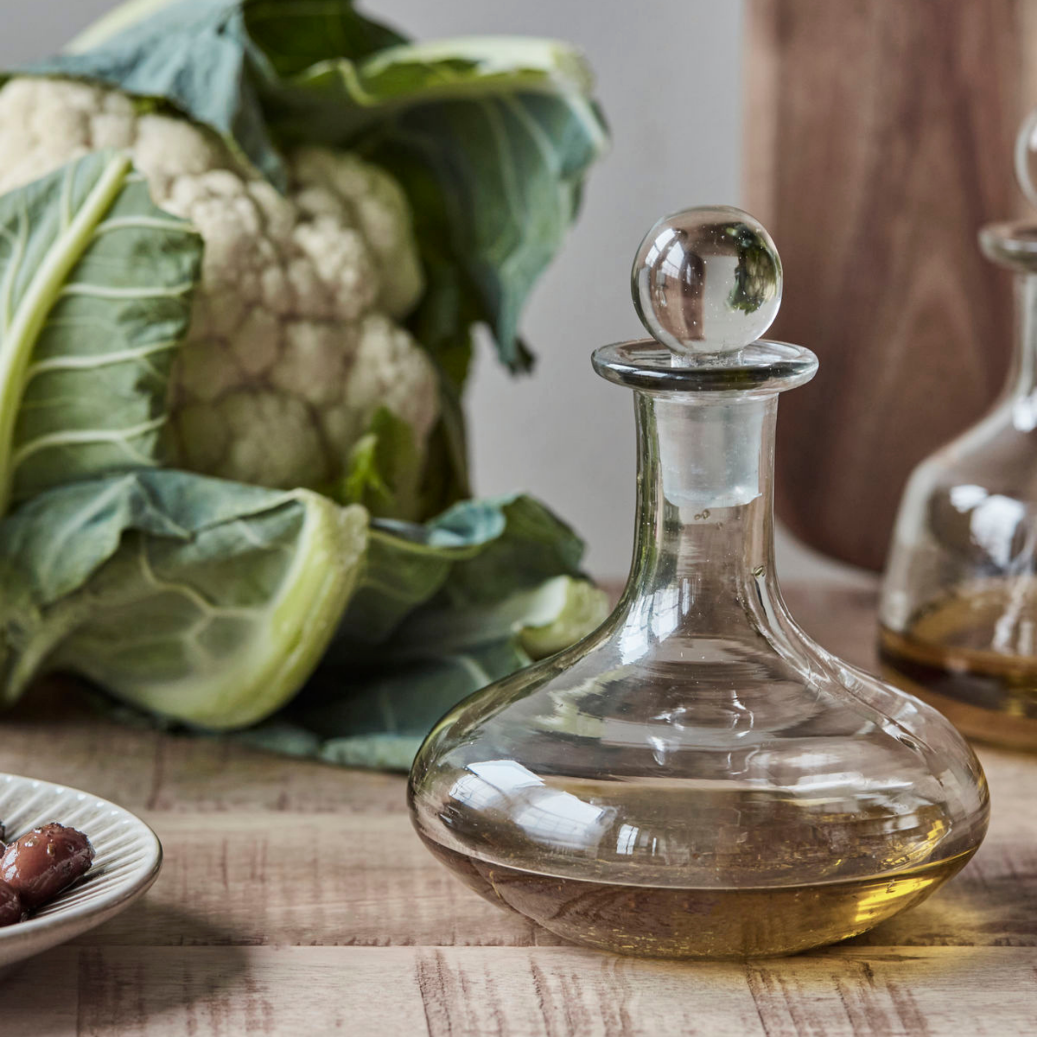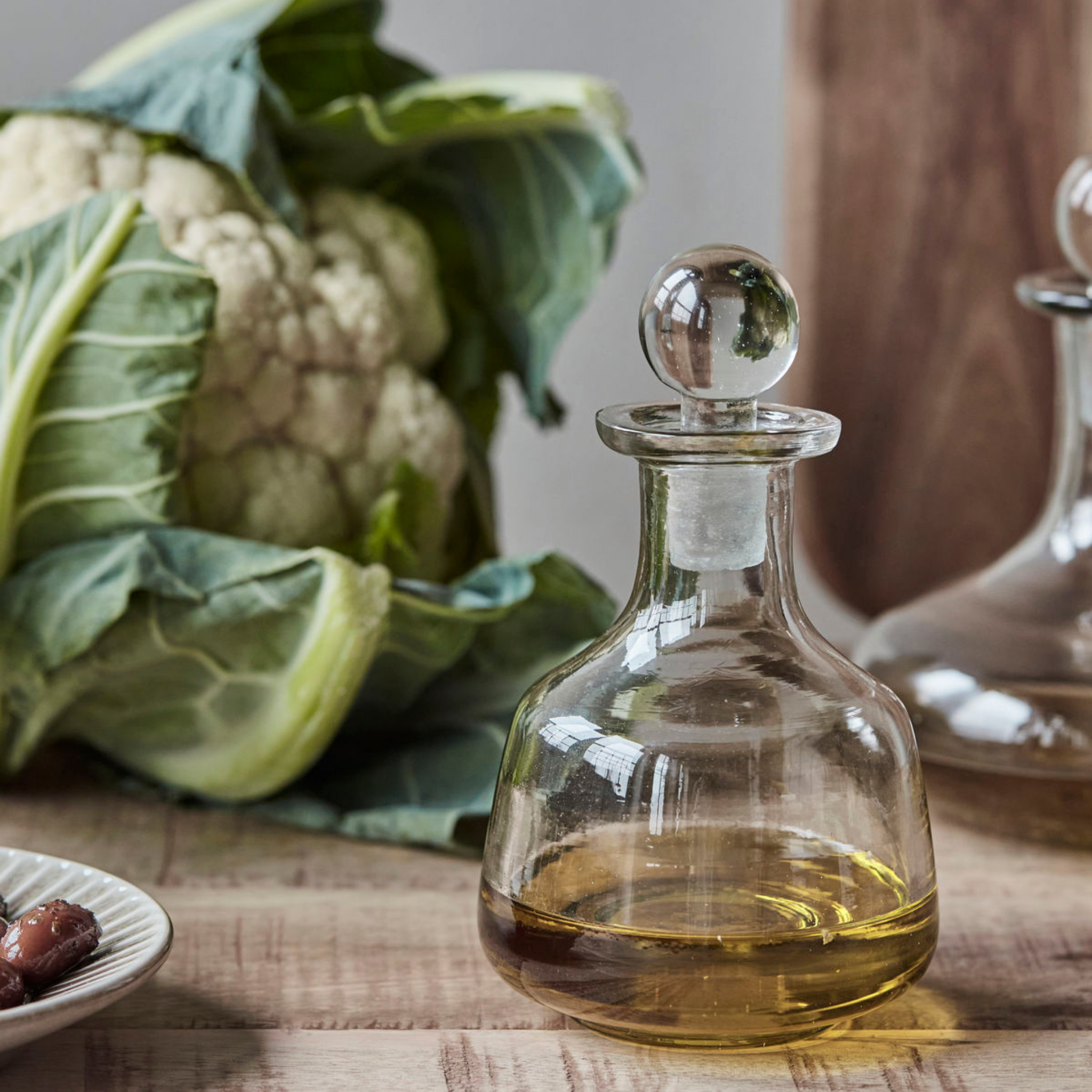 Med den transparente glaskaraffel med prop og lang eller kort hals har du altid olie og eddike ved hånden, når du laver mad. Og ved spisebordet kan dine gæster selv gøre salaten færdig med olivenolie, hjemmelavet dressing og vinaigrette.