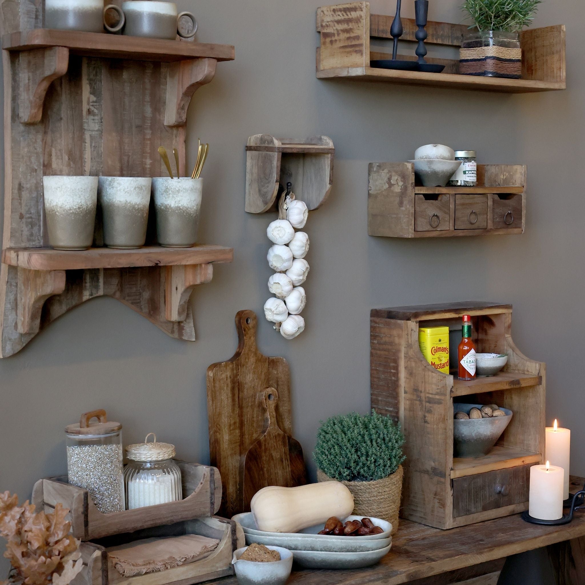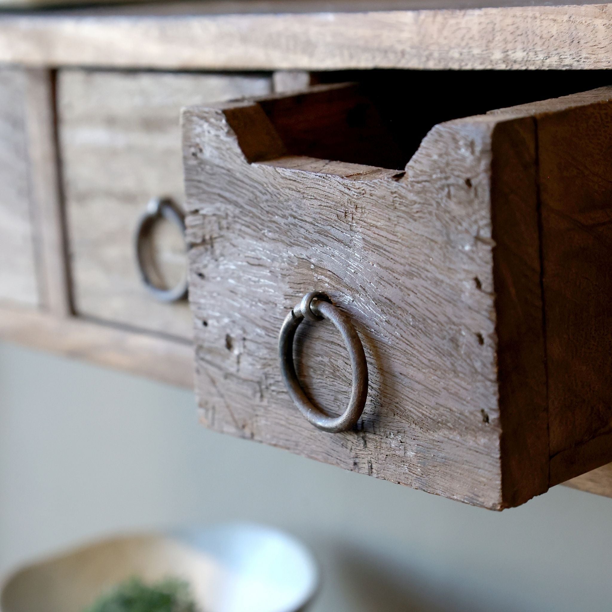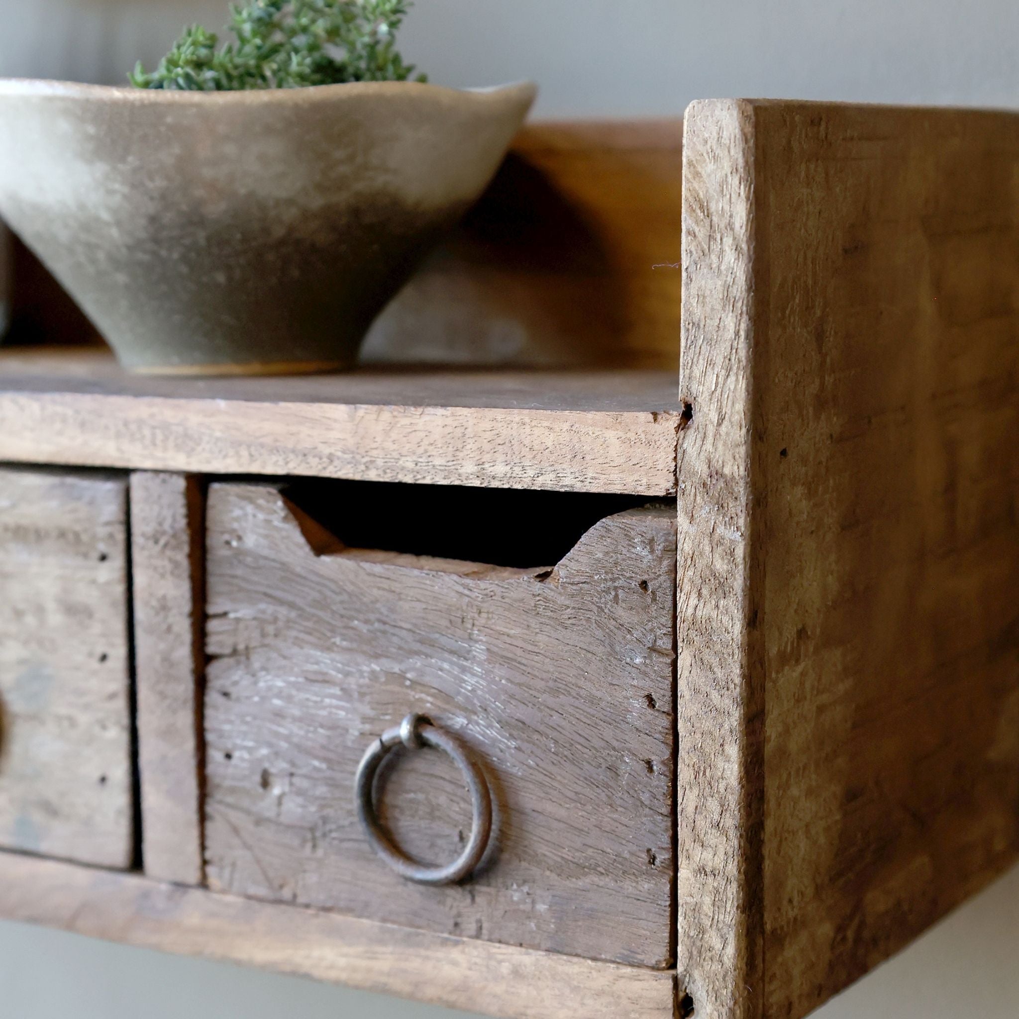 Grimaud hylden med tre skuffer er både praktisk og stilfuld – skabt i smukt genbrugstræ, der giver hvert møbel sit helt unikke udtryk.