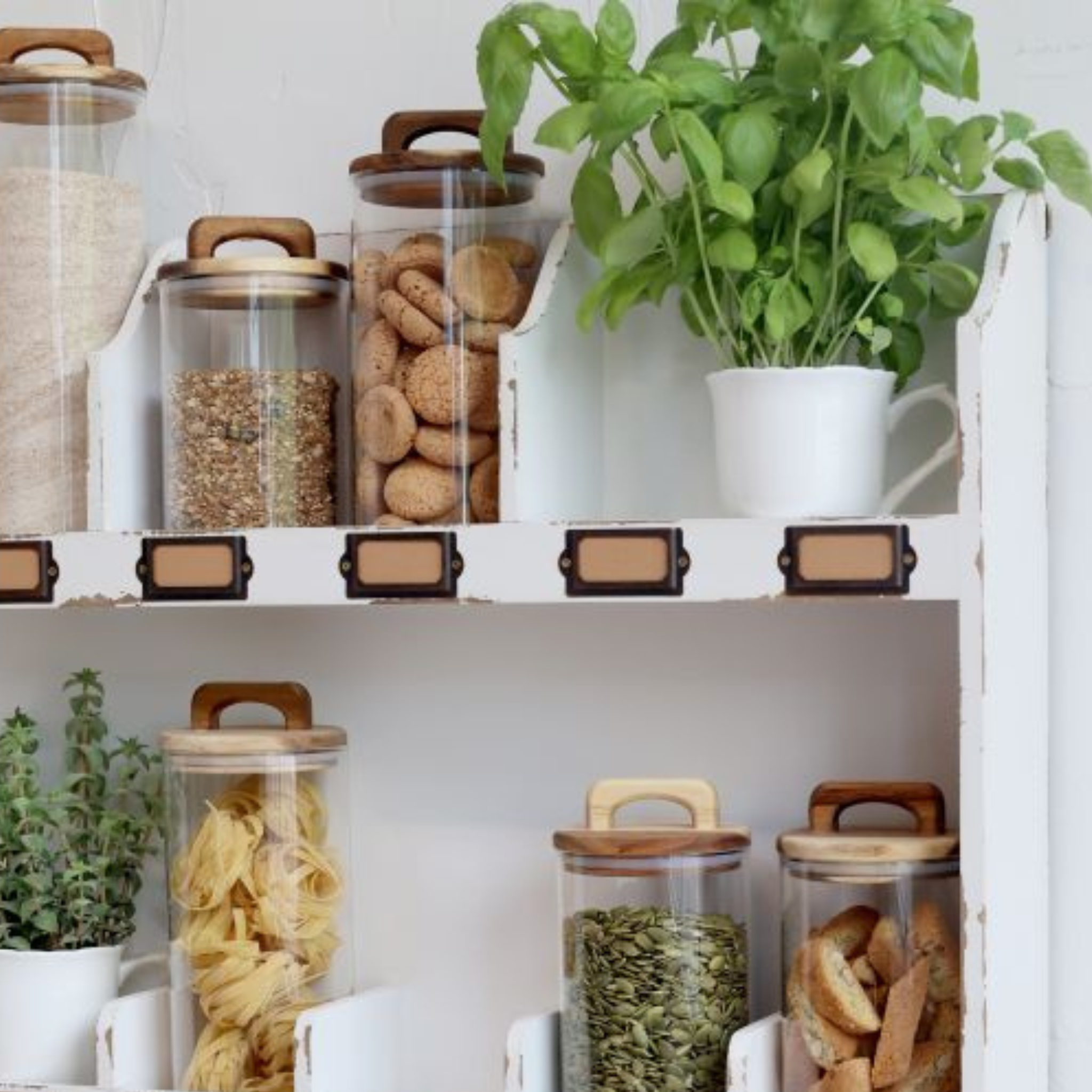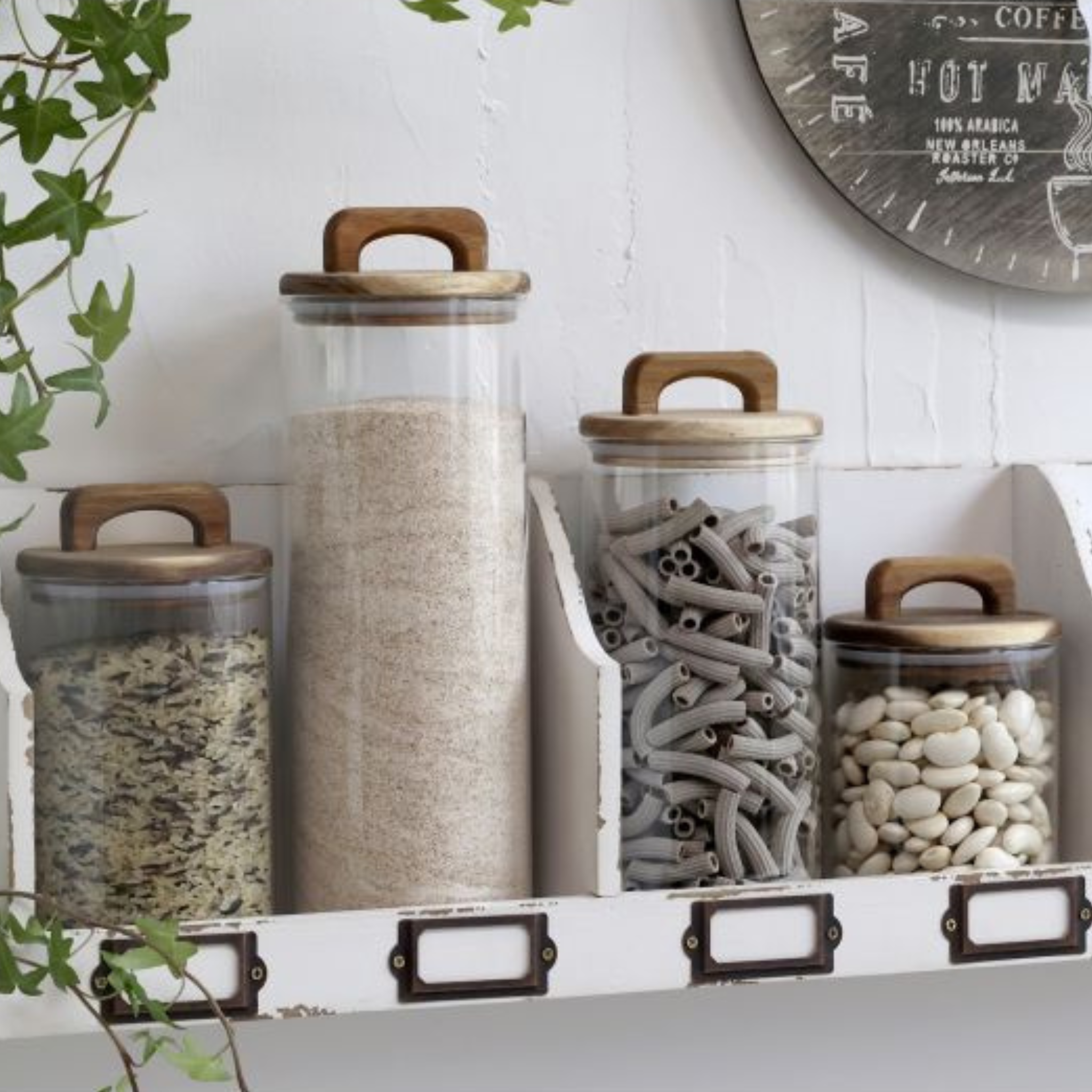 Stilfulde og flotte opbevaringsglas med låg af akaciatræ fra Chic Antique.