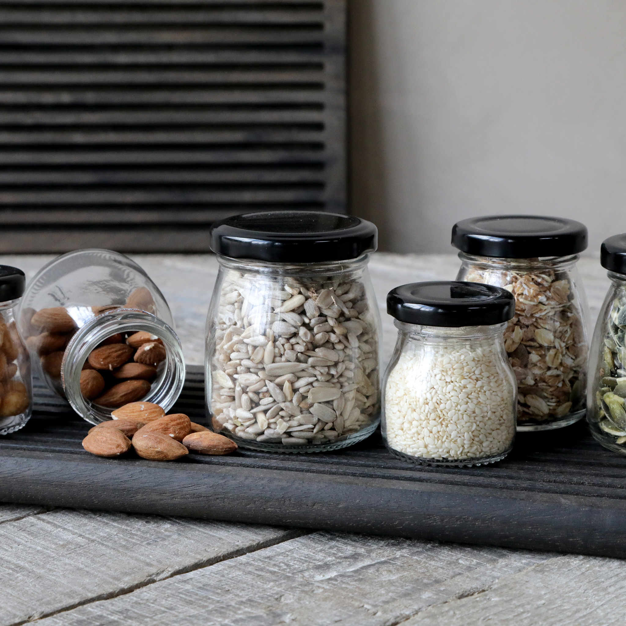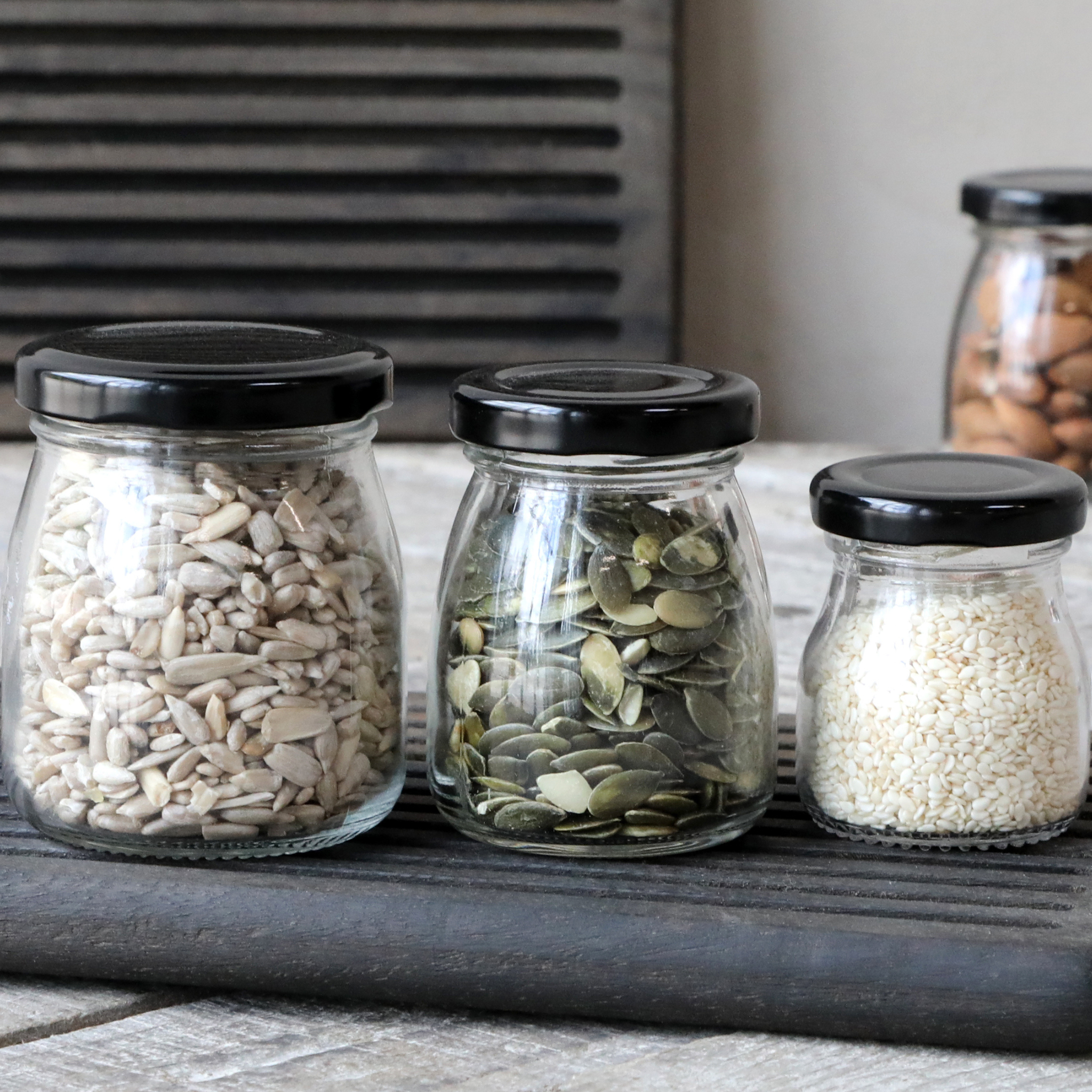Brug evt. glassene i køkkenet til opbevaring af nødder, kerner, linser eller andre fødevarer, og lad dem stå fremme til pynt.