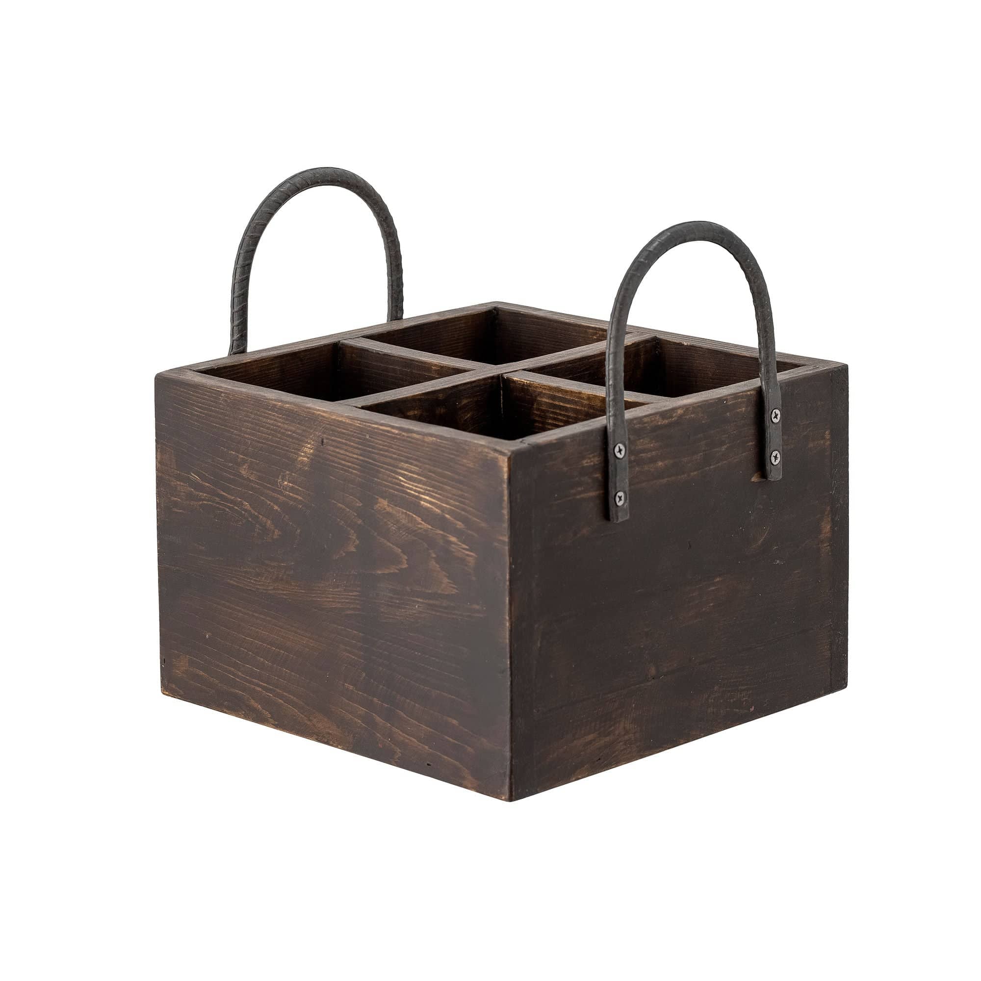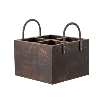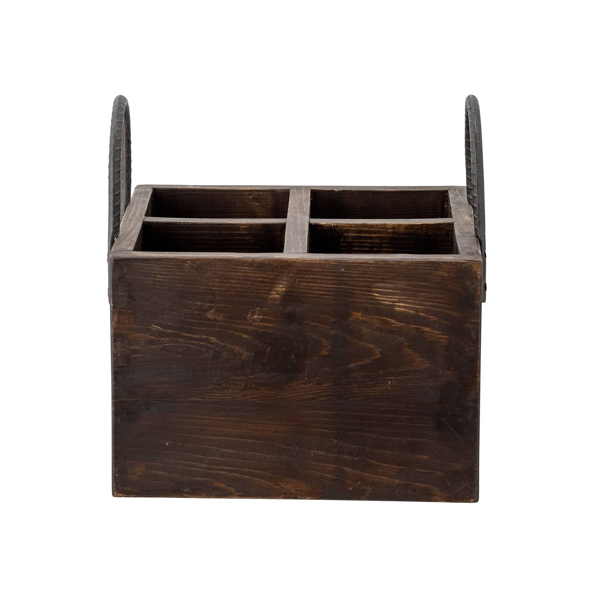 Boxen har et rustikt og naturligt look med 4 rum og 2 håndtag.
