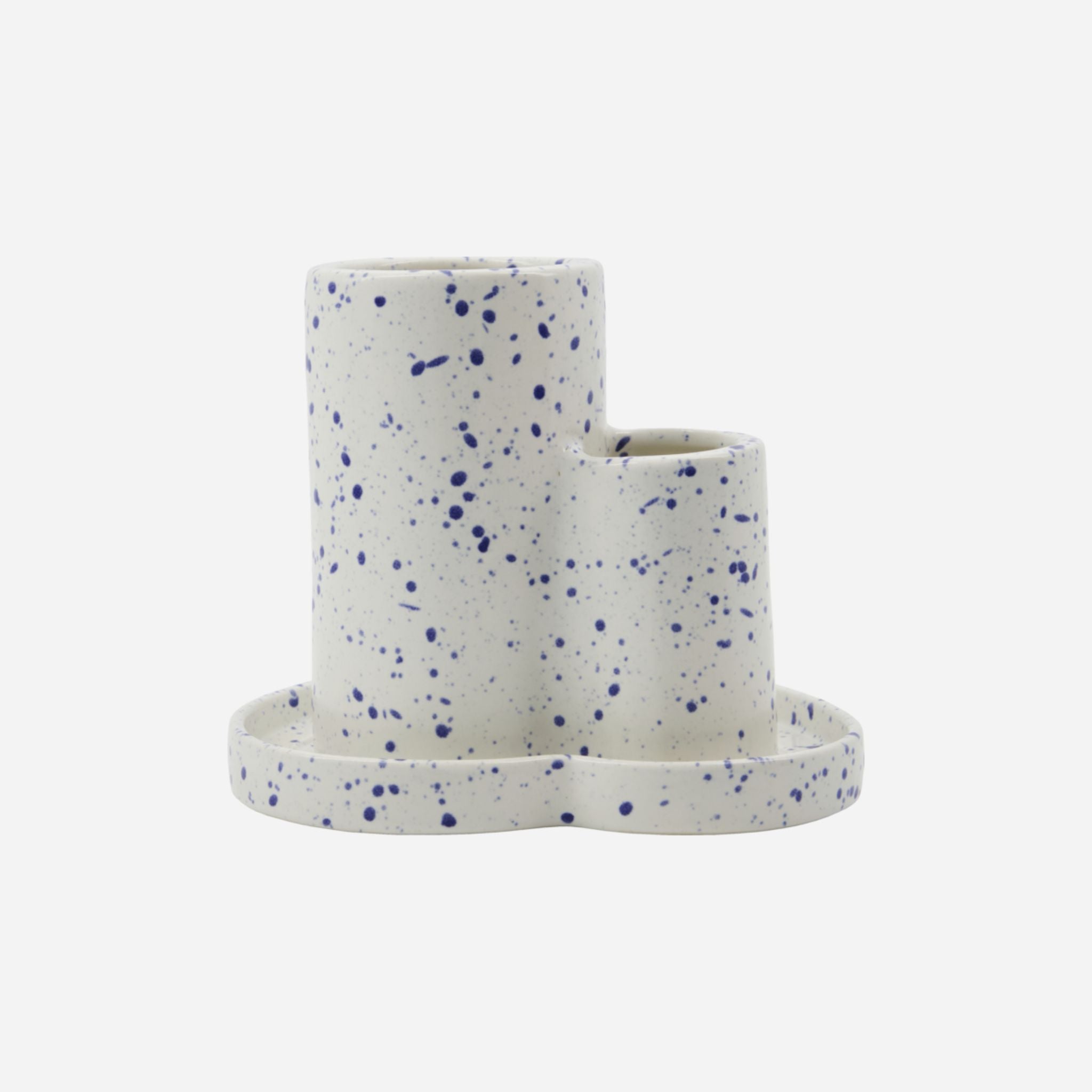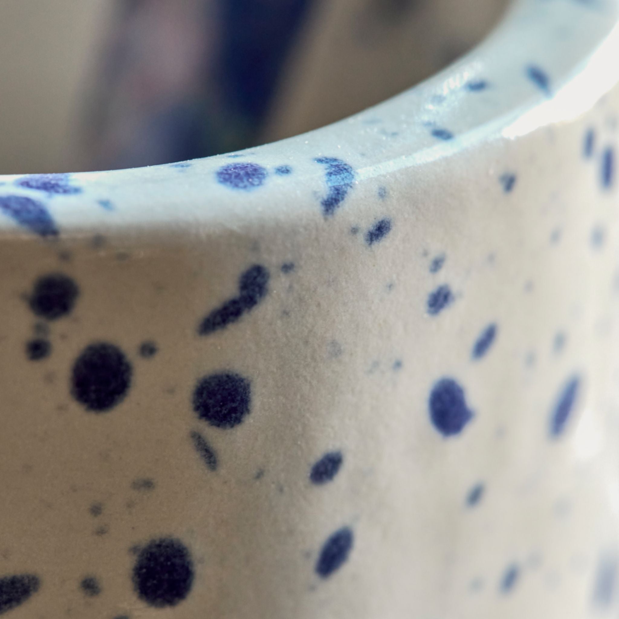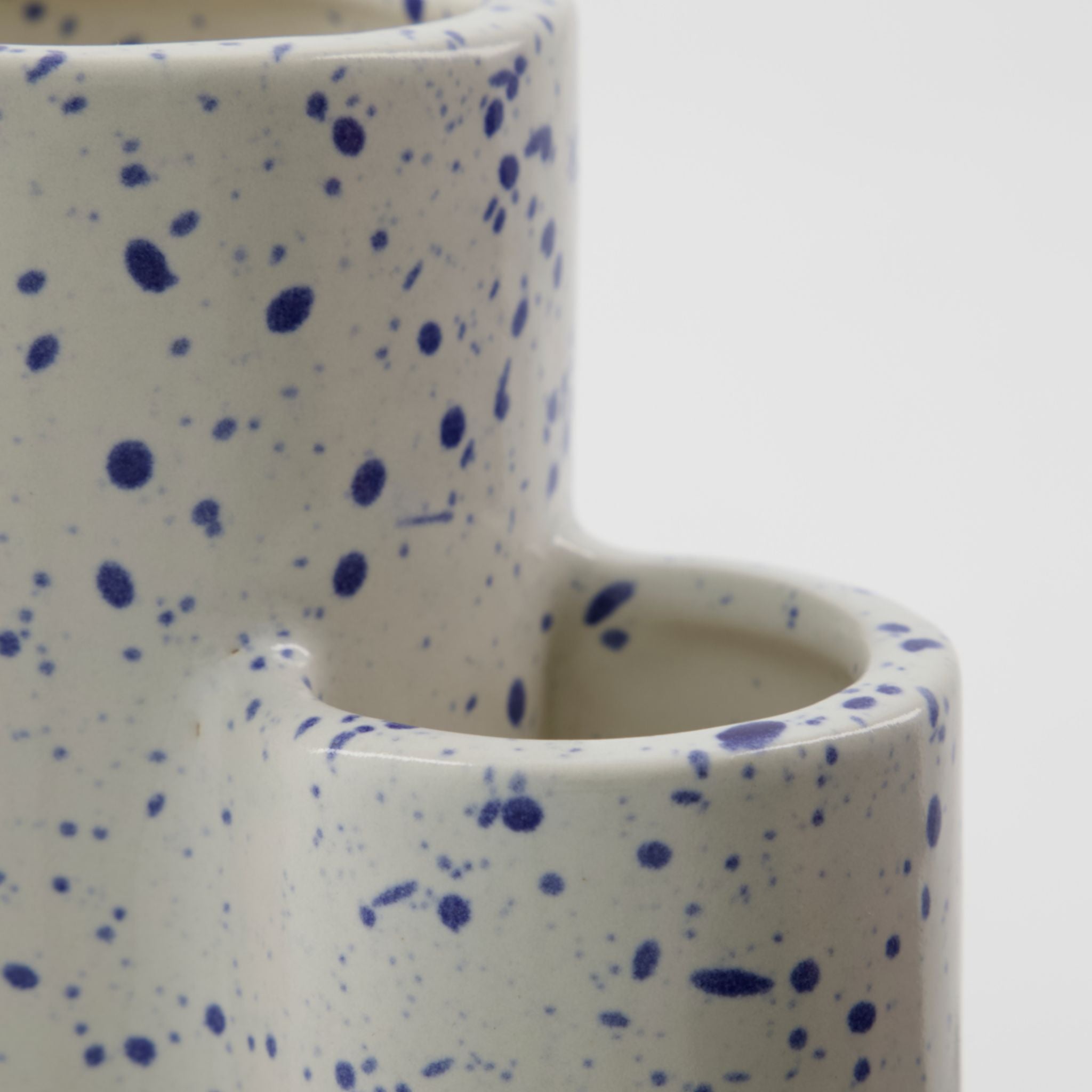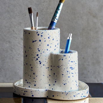 Denne unikke organizer, håndlavet i keramik, kombinerer funktionalitet med stilfuldt design. Den off-white base prydes af et smukt blåt splash-mønster, der tilfører et moderne touch til dit hjemmekontor, køkken eller stue. Perfekt til opbevaring af sakse, kuglepenne og småting. De to cylindriske holdere i varierende størrelser giver både fleksibilitet og et elegant udtryk.