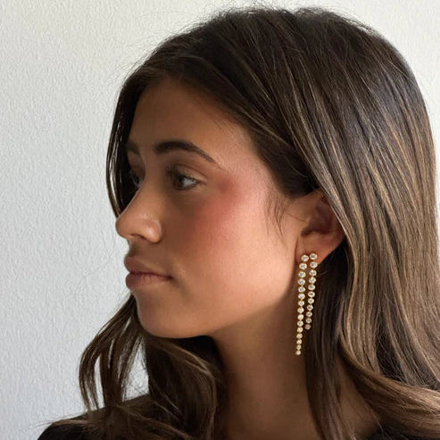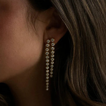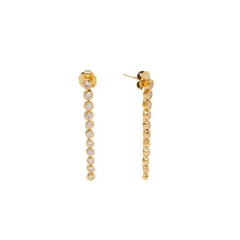 Smukke lange øreringe i guldbelagt messing med klare krystaller. Længden er 4,5 cm. Alle smykker fra Pico Copenhagen er nikkelfri.