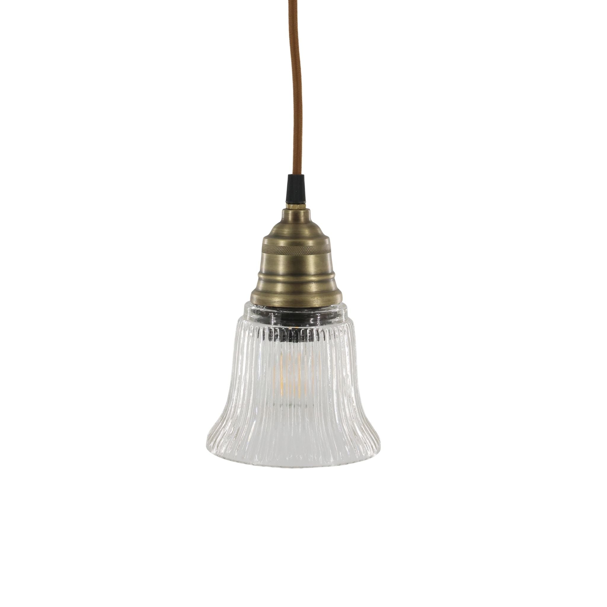 Denne yndige loftlampe forener klassisk elegance med et strejf af vintage charme. Lampen har en smuk og elegant klar glasskærm og en top i messing. Lampen passer perfekt over spisebordet, i entreen eller i det ene hjørne af stuen. Hæng en enkelt lampe op for et enkelt og elegant udtryk, eller kombiner med flere lamper for at skabe en harmonisk og personligt udtryk i din indretning.