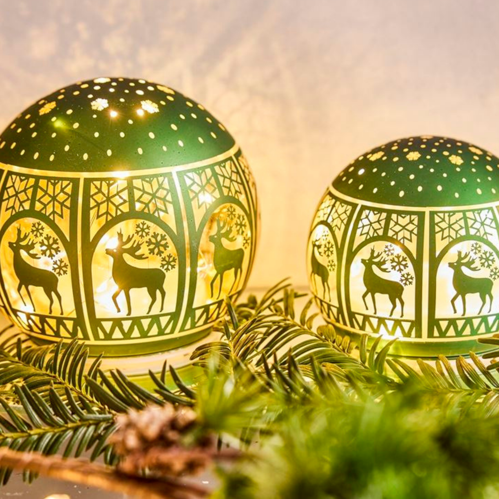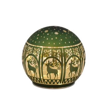 X-Mas glaskuglen er en smuk juledekoration i grøn glas med indbygget LED og timer, der får motivet til at lyse op og skabe en varm og hyggelig stemning.