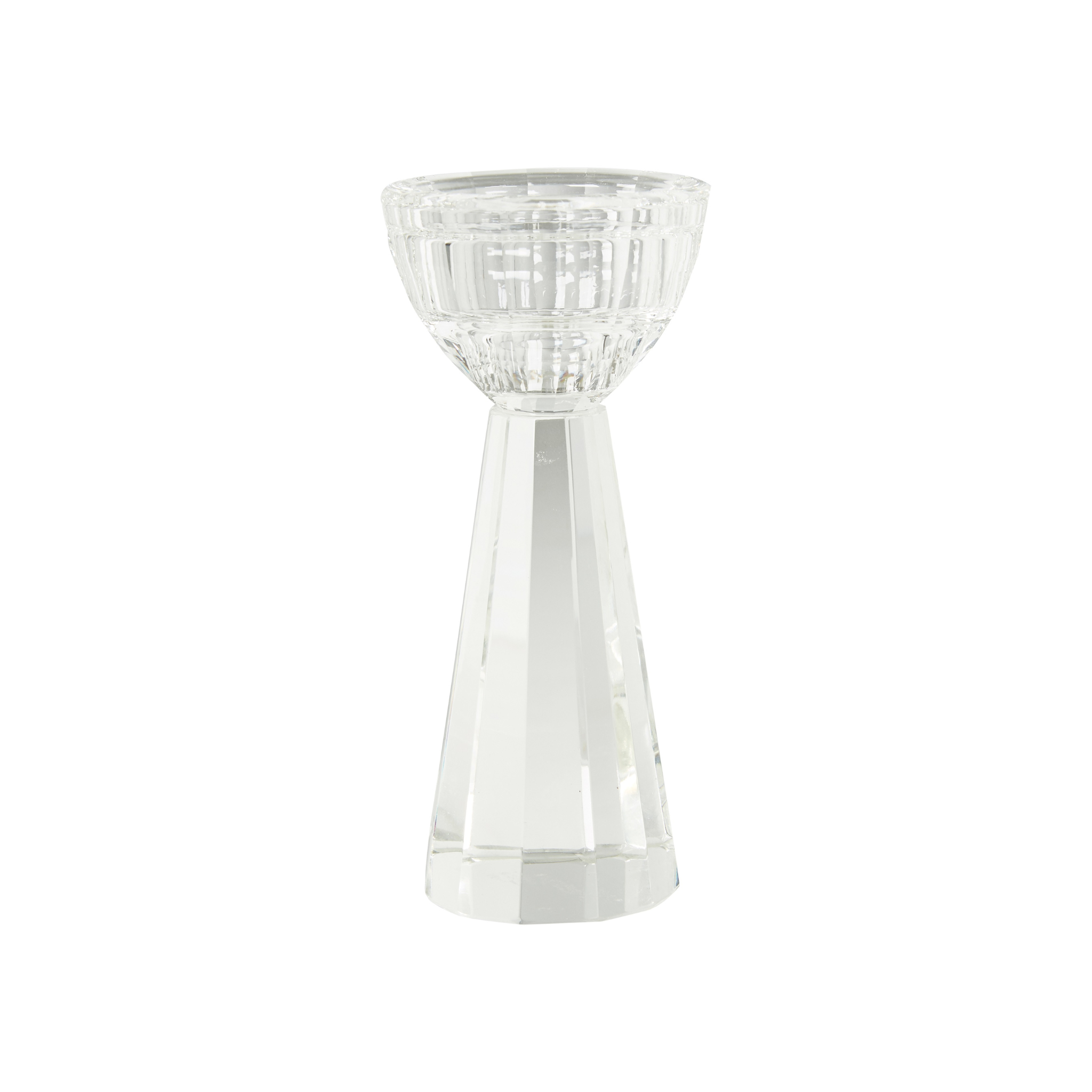 Smuk, unik og stilfuld lysestage i klart glas med en højde på 14 cm. Denne lysestage kan bruges både til fyrfadslys og kronelys.
