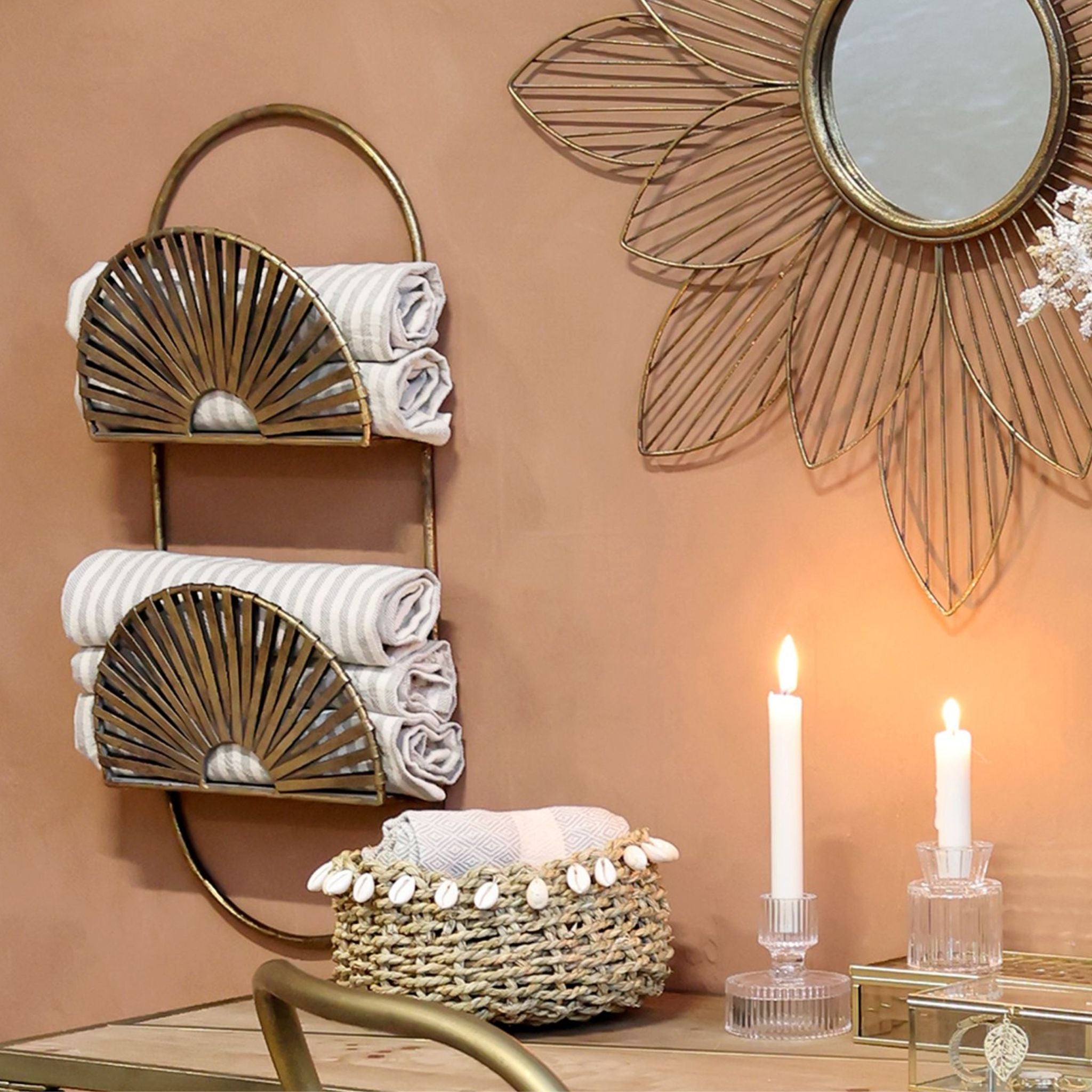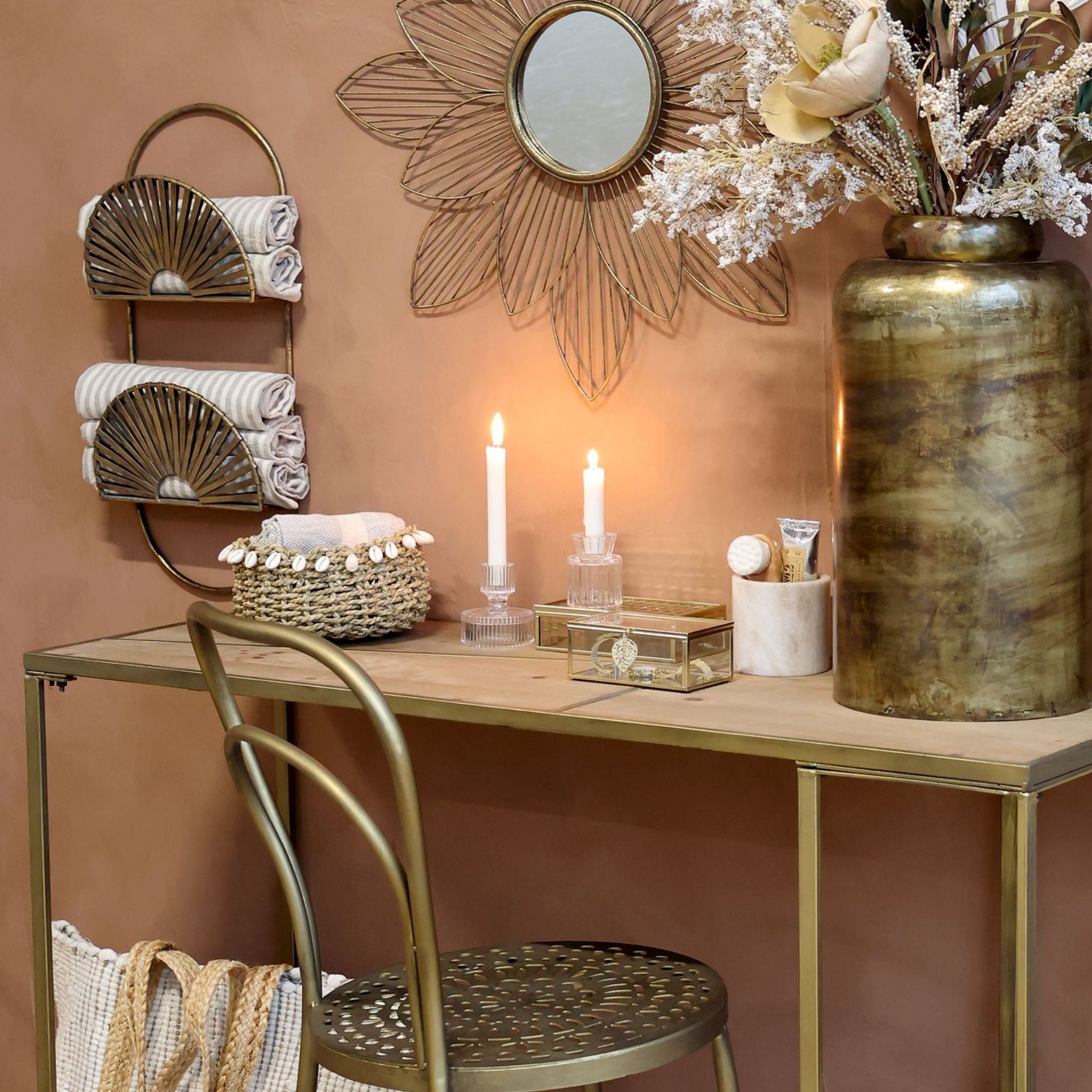 Denne elegante hylde fra Chic Antique er fremstillet i en smuk antique messing finish der tilføjer varme og charme til dit hjem. Hylden kombinerer praktisk opbevaring med dekorativt design og har fine detaljer der gør den til et unikt indslag i indretningen.