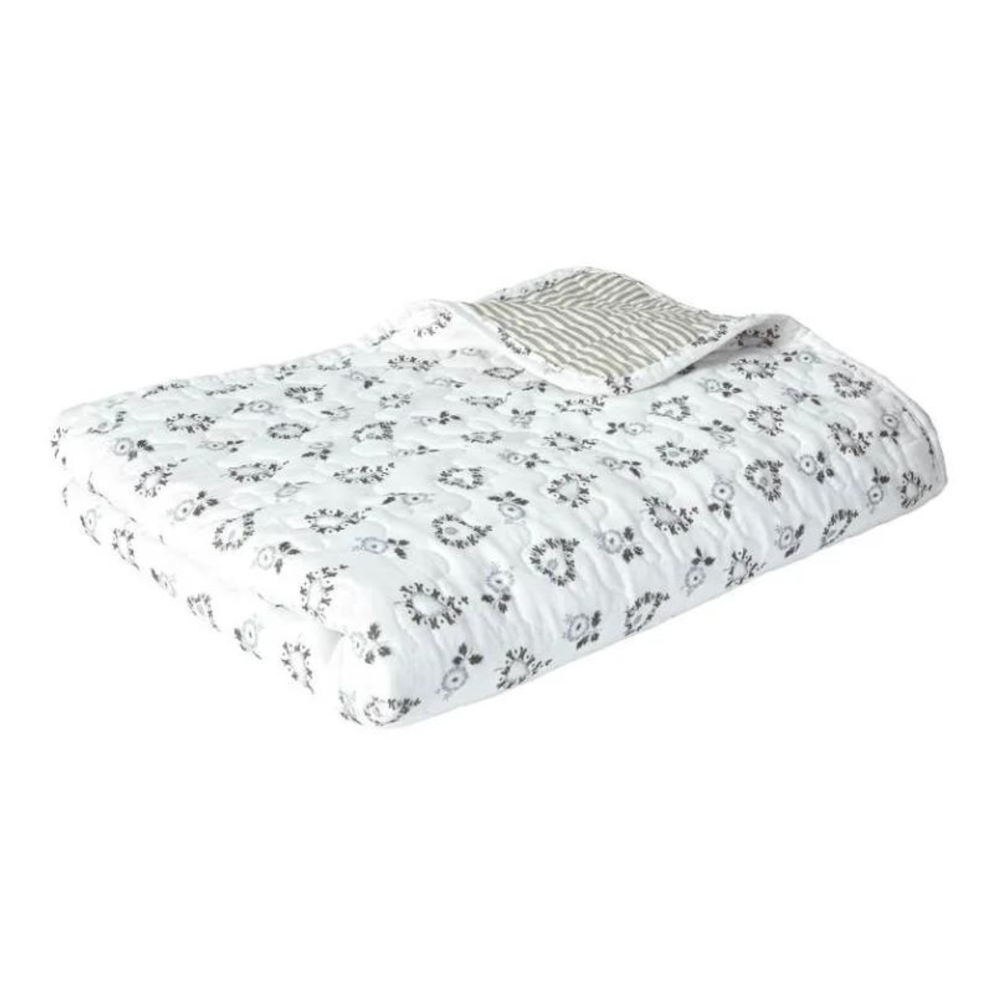 Plaiden har et stribet design på den side og blomster/hjerter på den anden side.