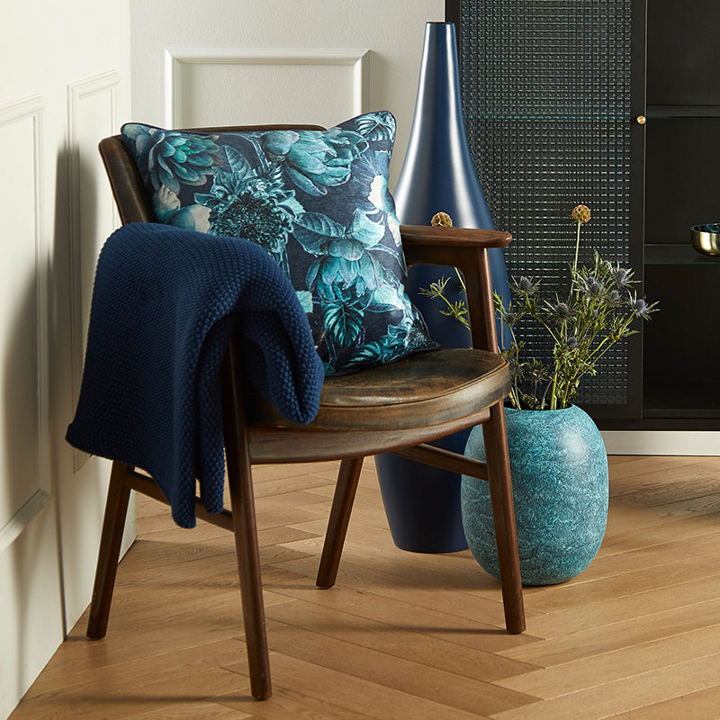 Cinthum pude er en lækker pyntepuder, i høj kvalitet fra inderst til yderst, som har et flot og detaljeret mønster i blålige farver.