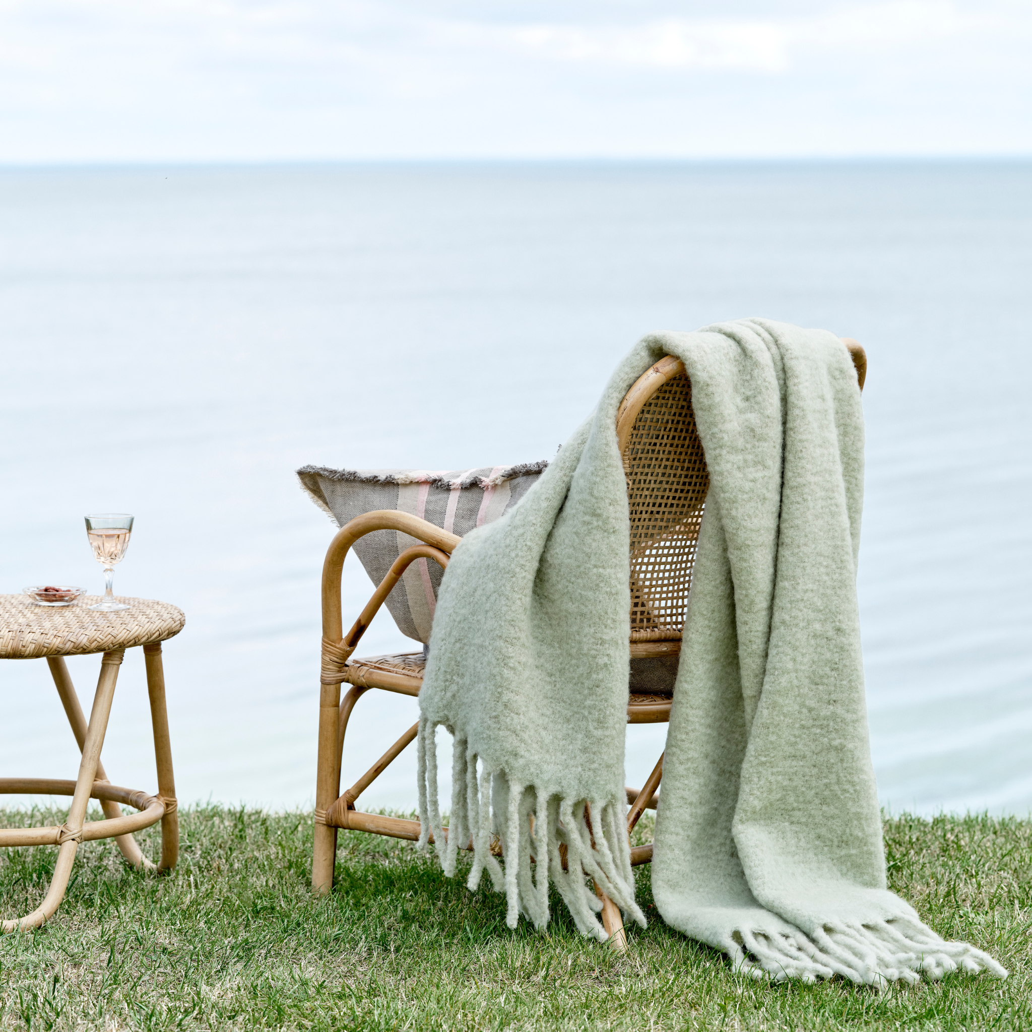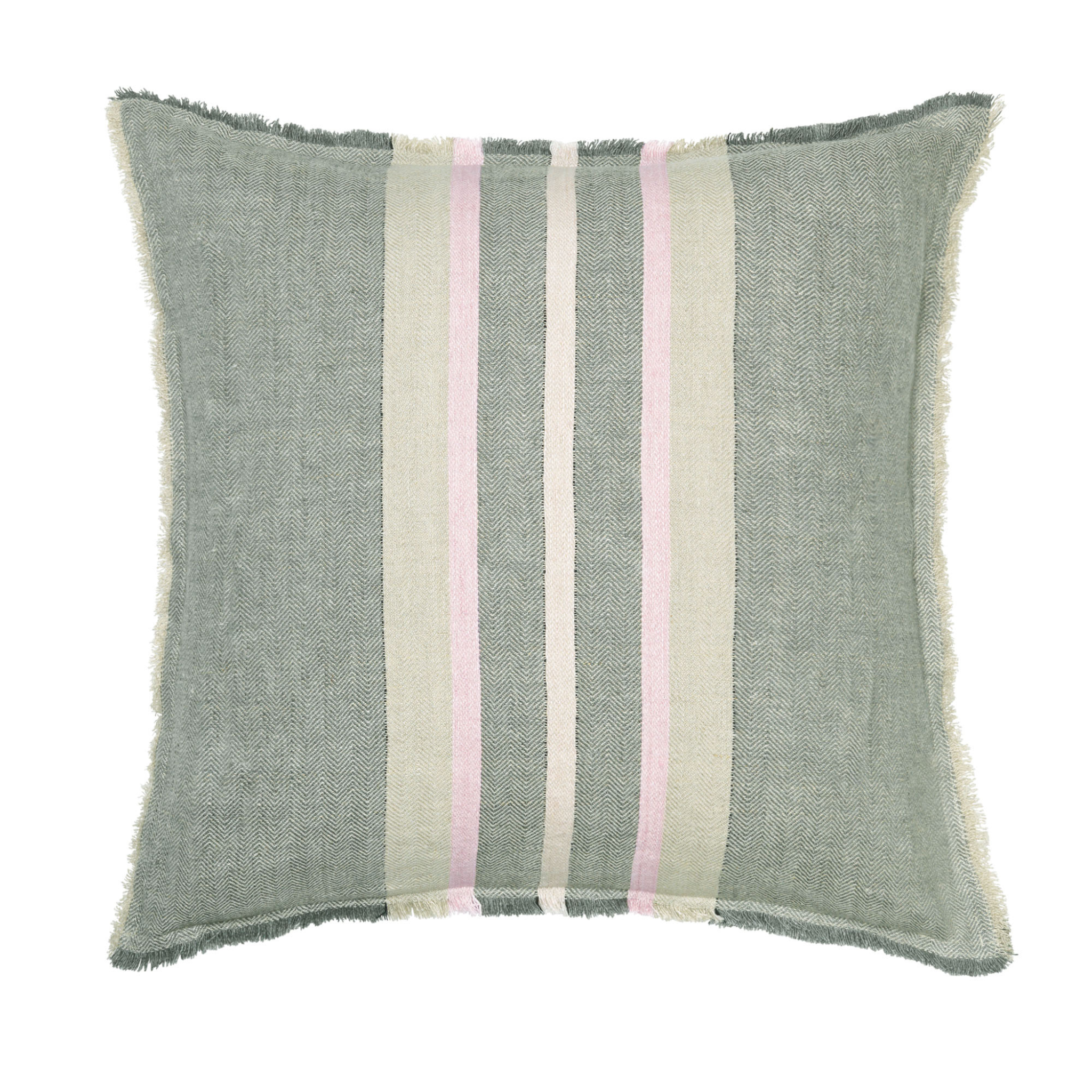 Flot og sommerlig pyntepude i smukke farver i støvet grøn og lyserød, med en frynset kant. Bring en glad stemning ind i dit hjem med denne skønne pude.