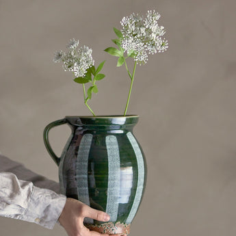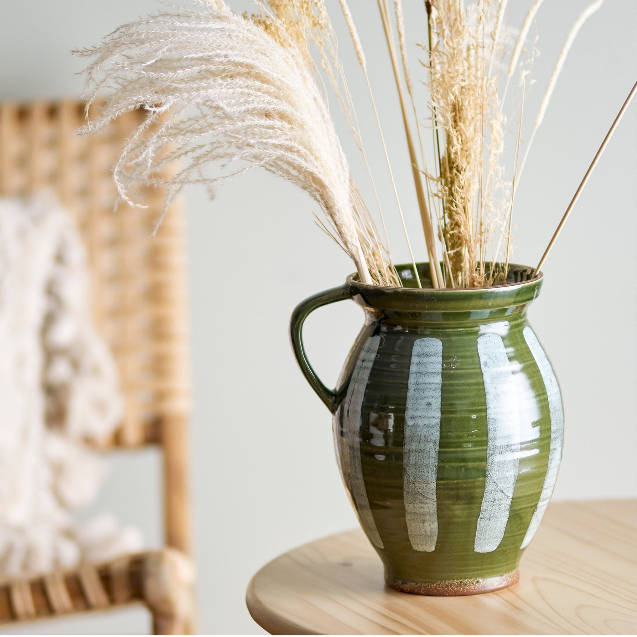 Hver vase har en unik finish takket være den smukke glasur, hvilket gør den til et kunstværk i sig selv. Dens rolige grønne farve bringer naturens skønhed ind i hjemmet og skaber en harmonisk balance i din indretning.