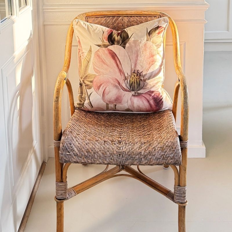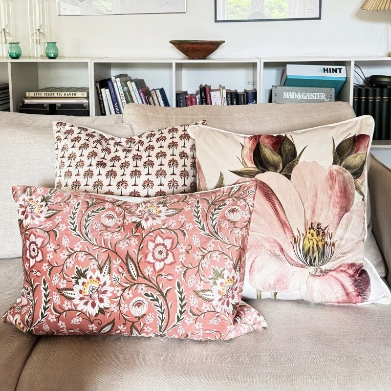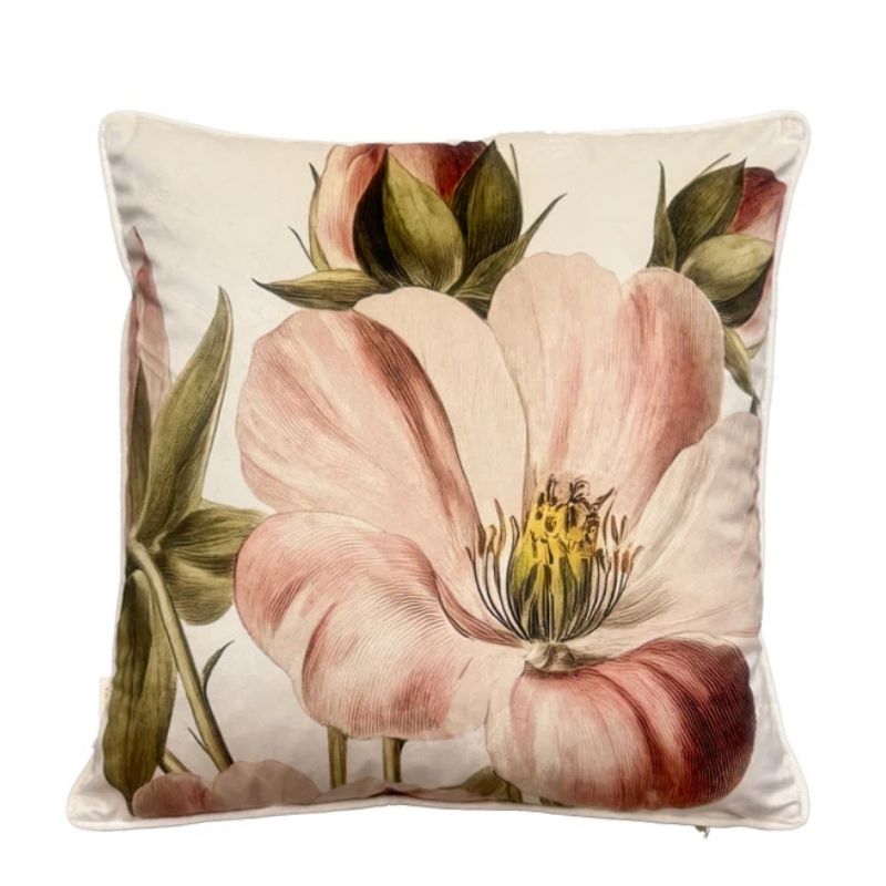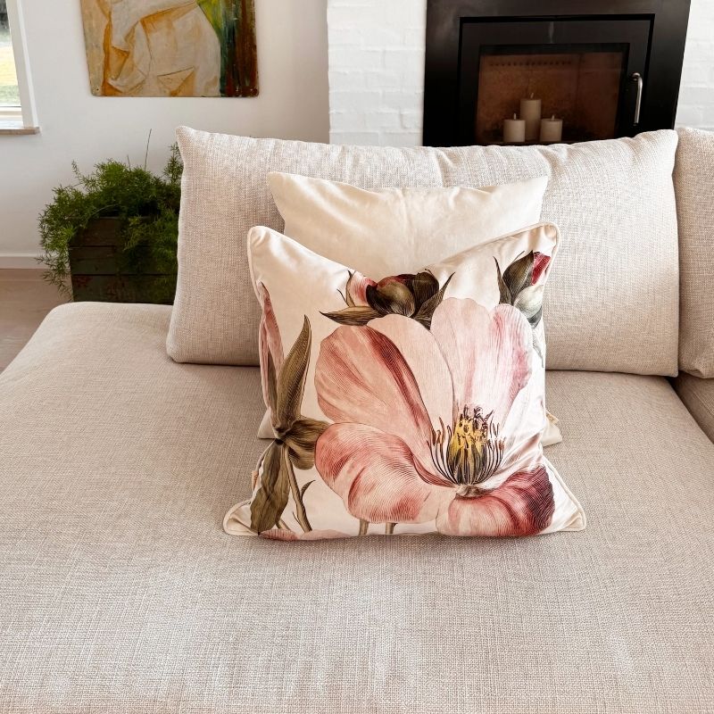 Pudebetræk 50x50 cm i skøn velour med blomstermotiv i rosa nuancer. Bagsiden af puden er creme farvet. At skifte betrækket på dine pyntepuder er en nem og hurtig måde, hvorpå du kan forny din indretning.