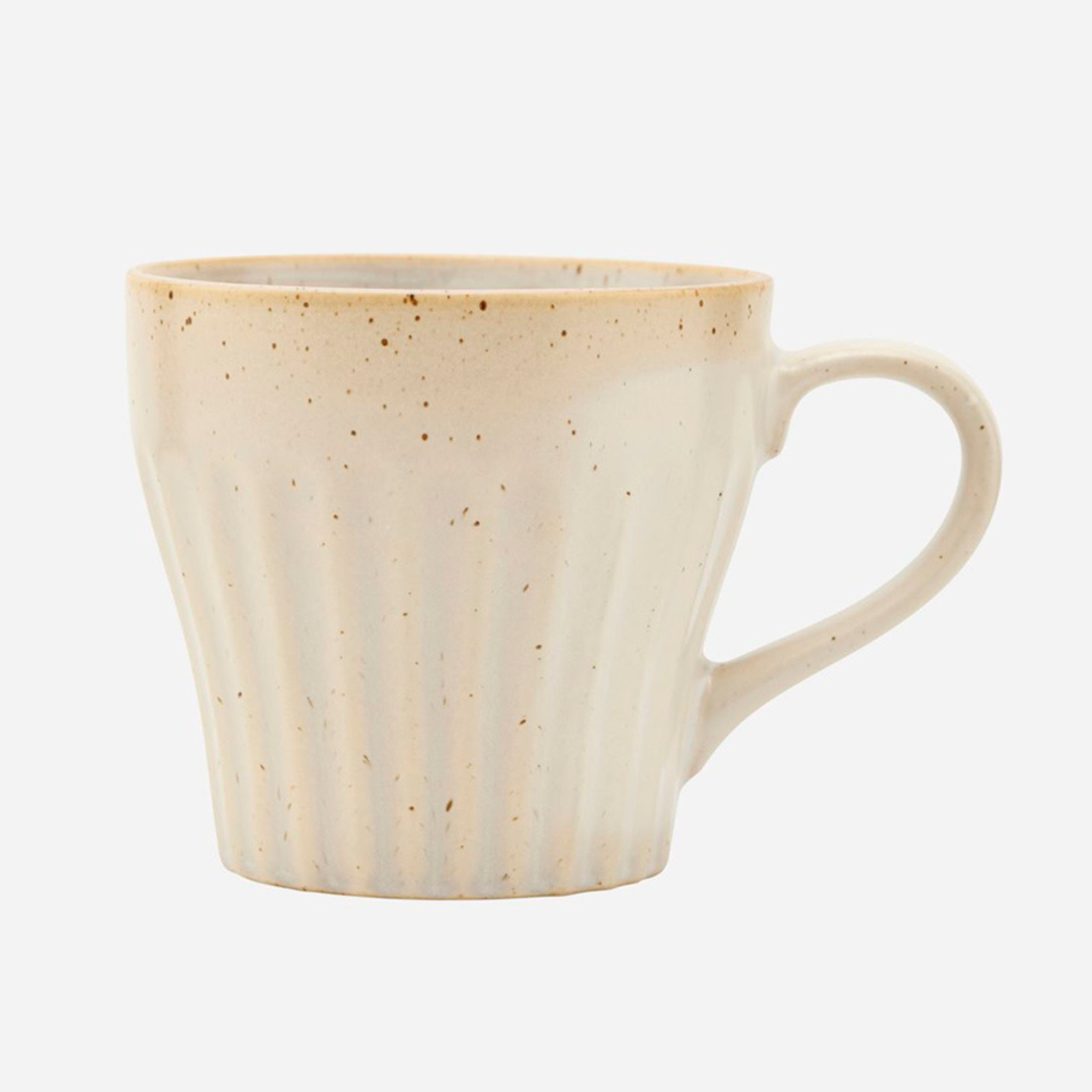 Det riflede design og den plettede glasering tilføjer et moderne look til koppen, som er behagelig at holde ved takket være hanken.