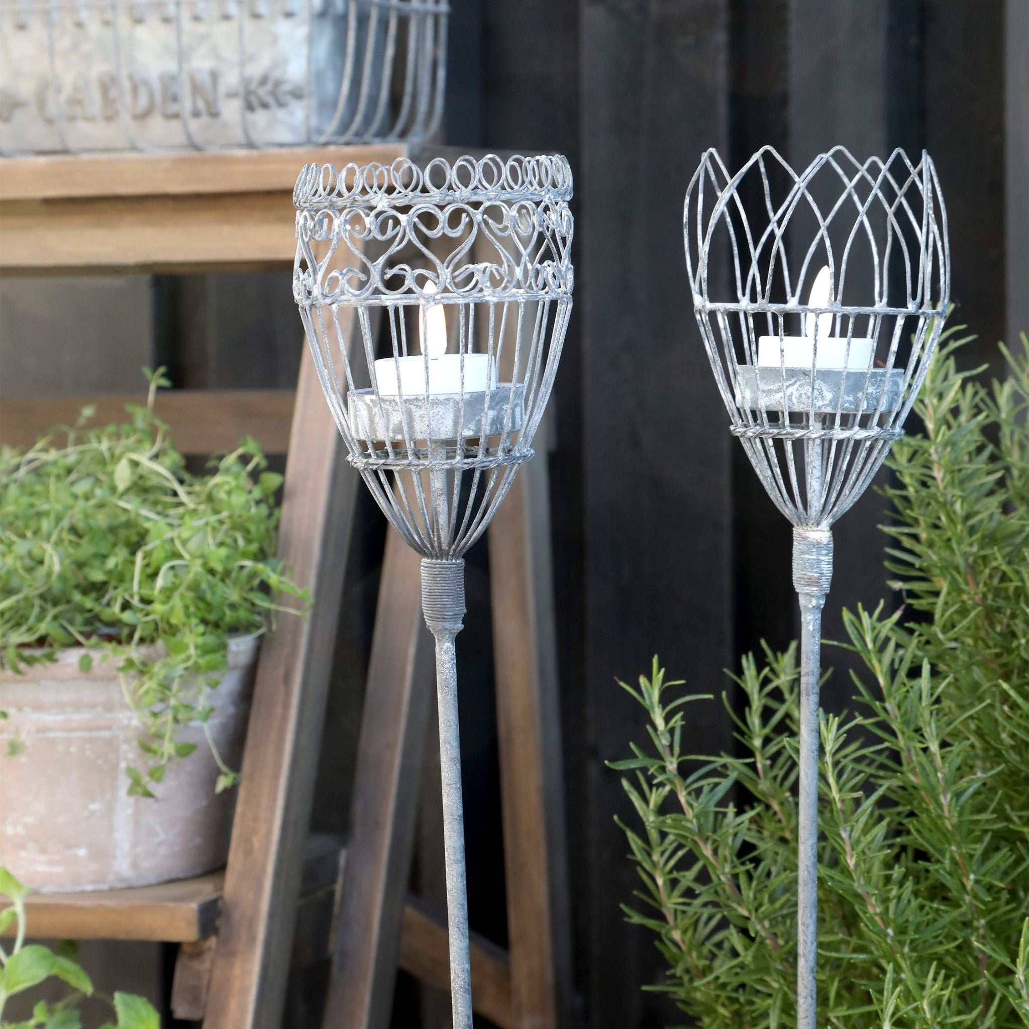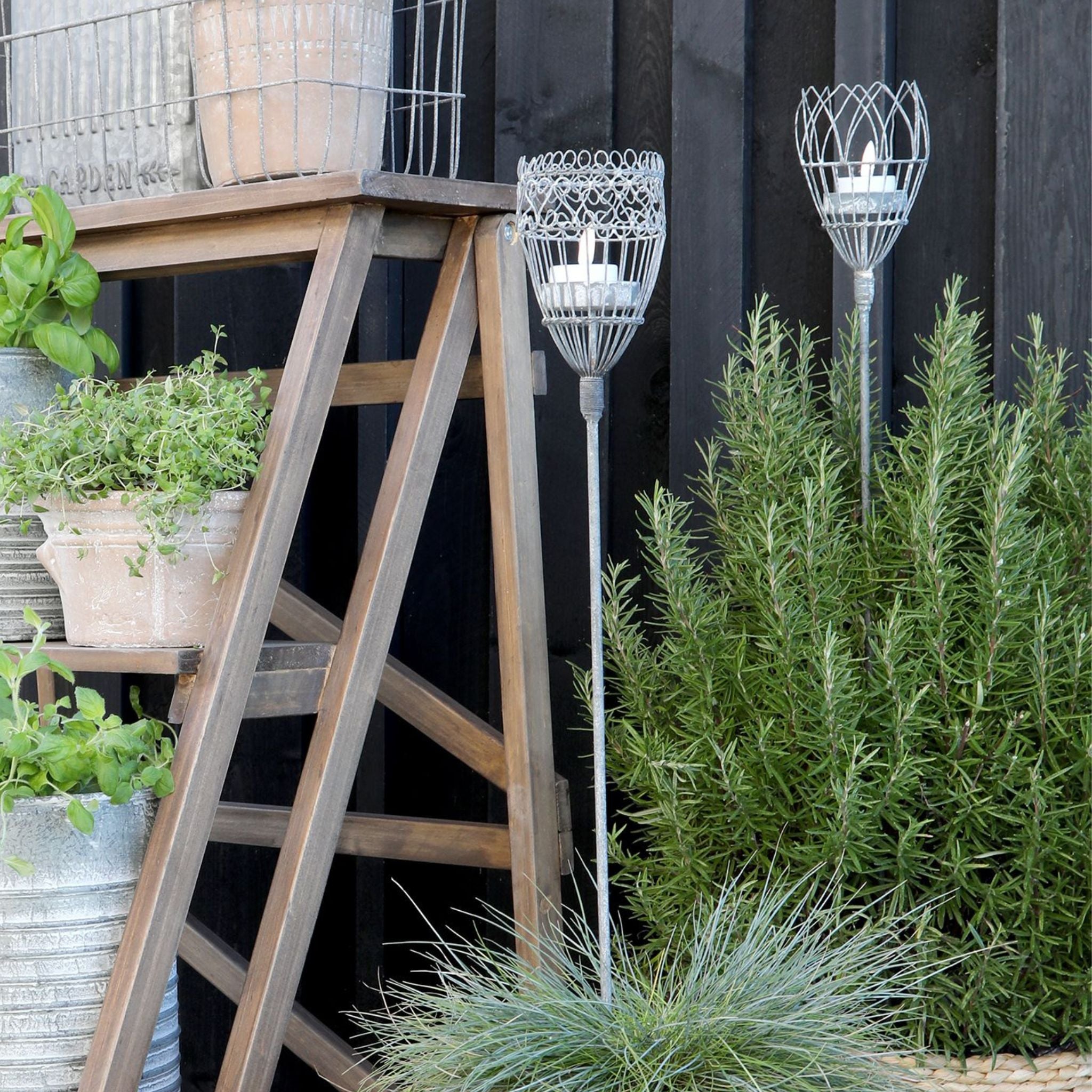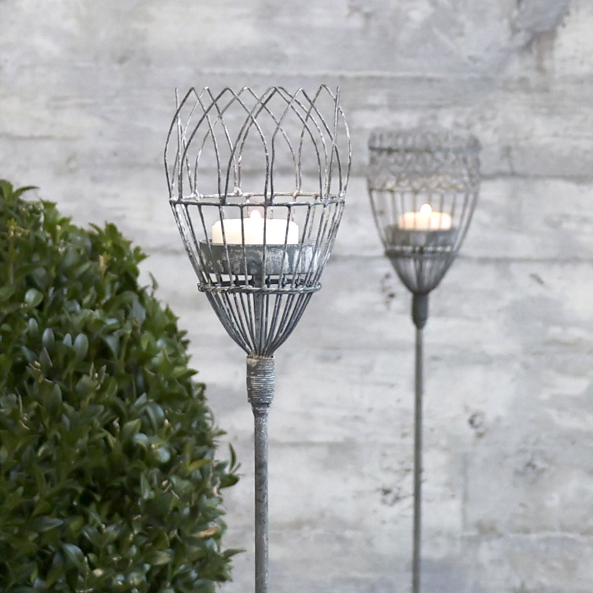 Skab den hyggeligste stemning på terrassen, i haven eller på altanen med disse smukke spyd med fyrfadslys fra Chic Antique. Spyddet er fremstillet af robust jern og har en smuk antique zink gave, der tilfører et rustikt og charmerende udtryk til din udendørs indretning.