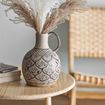 Hver vase er unik, da den er hånddekoreret, hvilket giver den et personligt præg og ekstra charme. Perfekt til friske blomster, tørrede buketter eller som en dekorativ detalje i hjemmet.