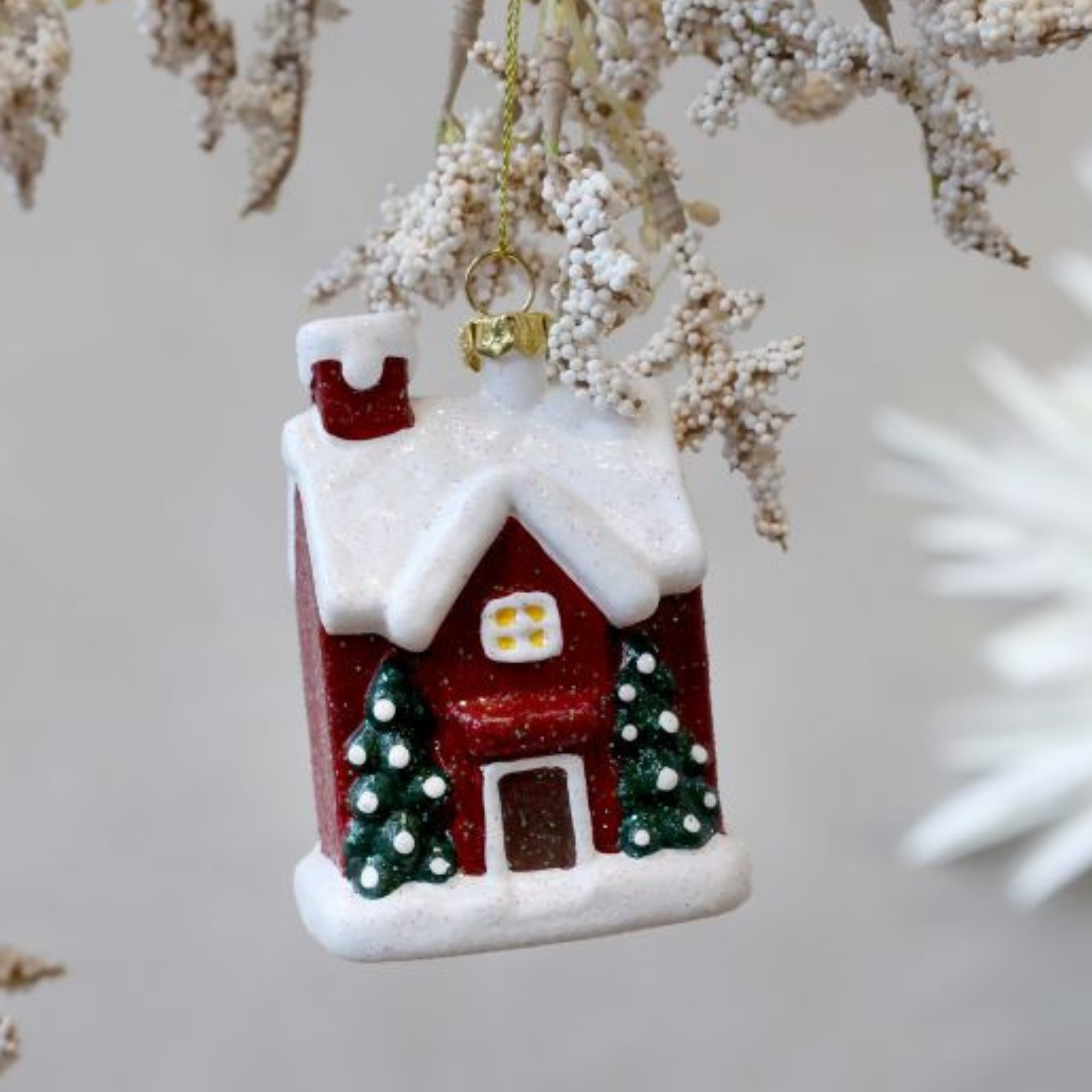 Tilføj et charmerende vintage-touch til din juleudsmykning med vores elegante hus til ophæng. Fremstillet i polystyren og malet i en livlig cherry-farve, er dette dekorative hus både let og holdbart. Det klassiske design med sin delikate farve og fine detaljer skaber en varm og indbydende atmosfære, perfekt til at hænge i vinduet, på juletræet eller som en del af din borddekoration. Lad dette hus bringe en nostalgisk følelse og festlig glæde til dit hjem, og skab en magisk julestemning, som dine gæster vil elske.