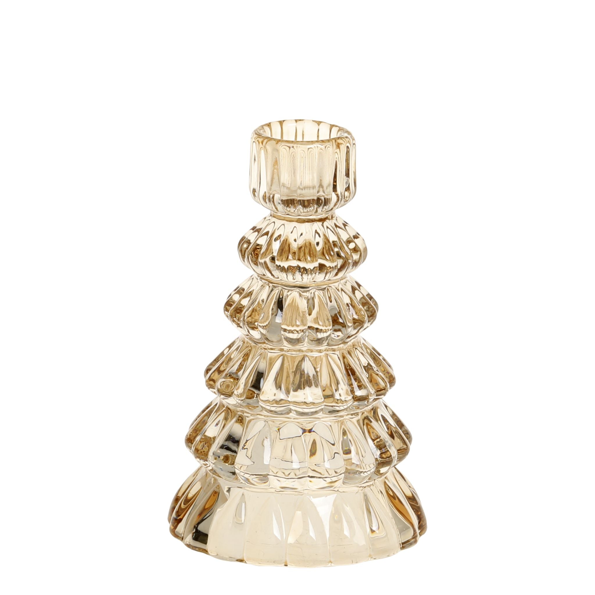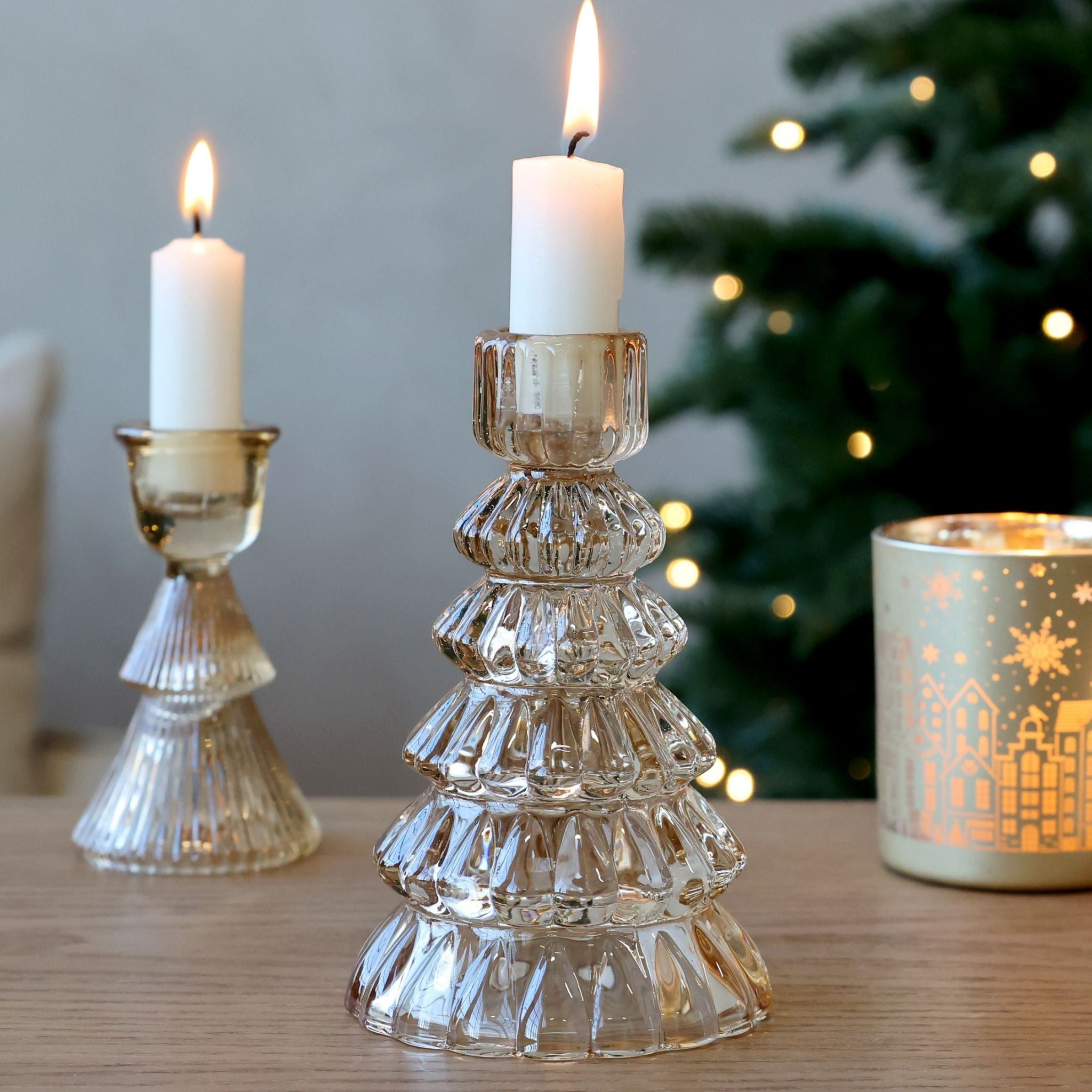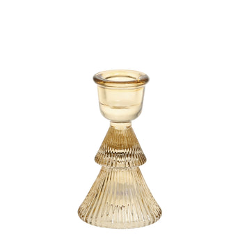 Bring julestemning ind i dit hjem med disse elegante lysestager formet som fine juletræer. Lysestagerne kommer i en smuk amber farve, der tilføjer en gylden glød og charme til din indretning.