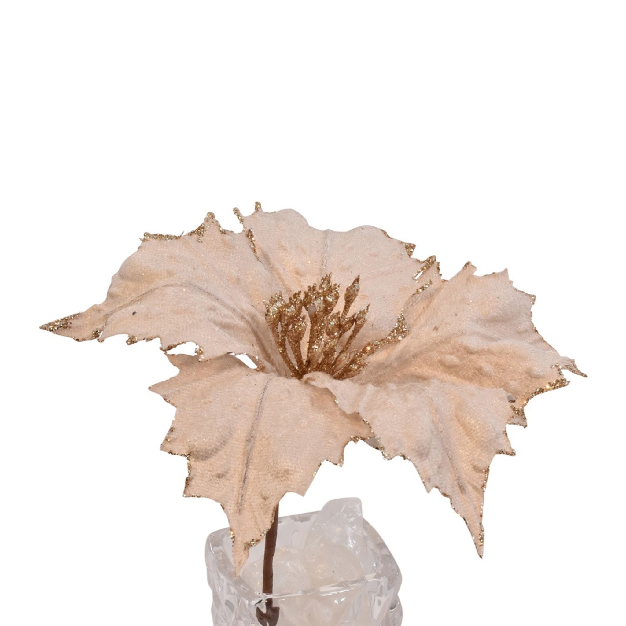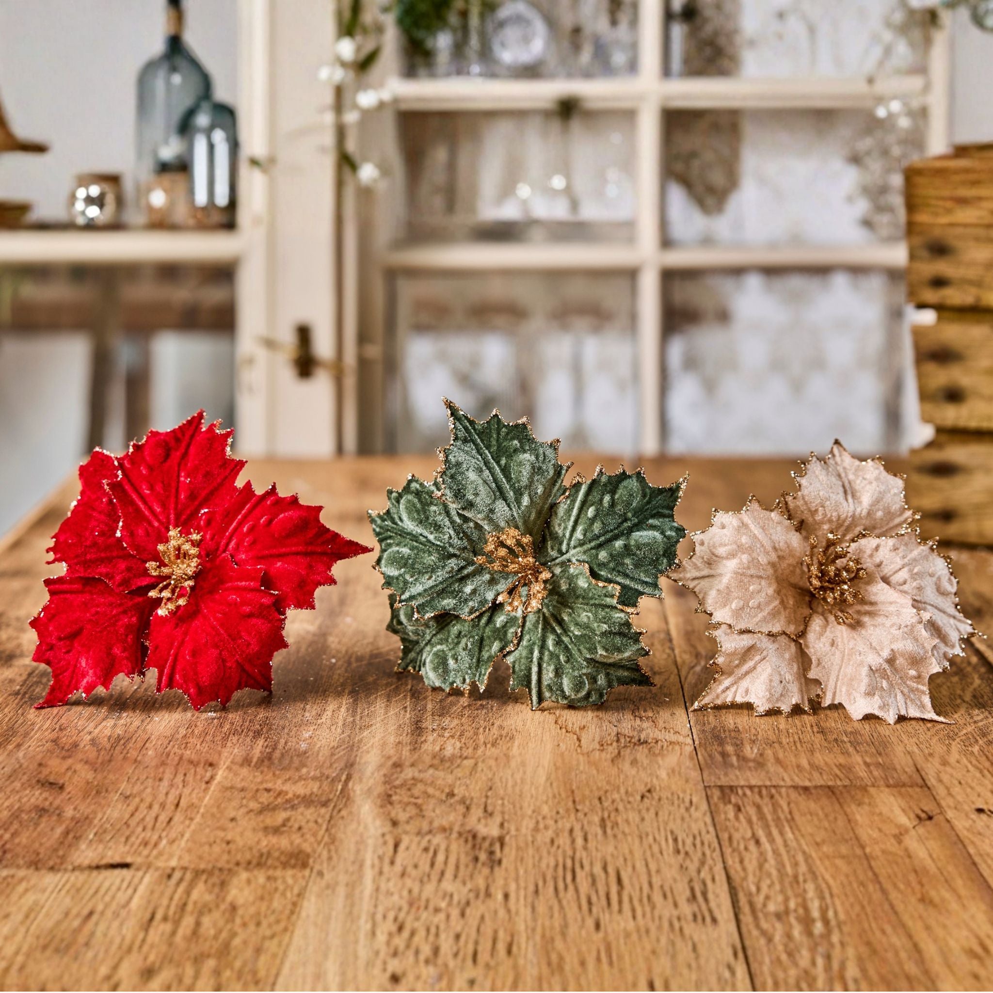 De naturtro blade og blomster skaber et elegant og varmt udtryk, perfekt til både dekorationer, vaser og juleopstillinger.